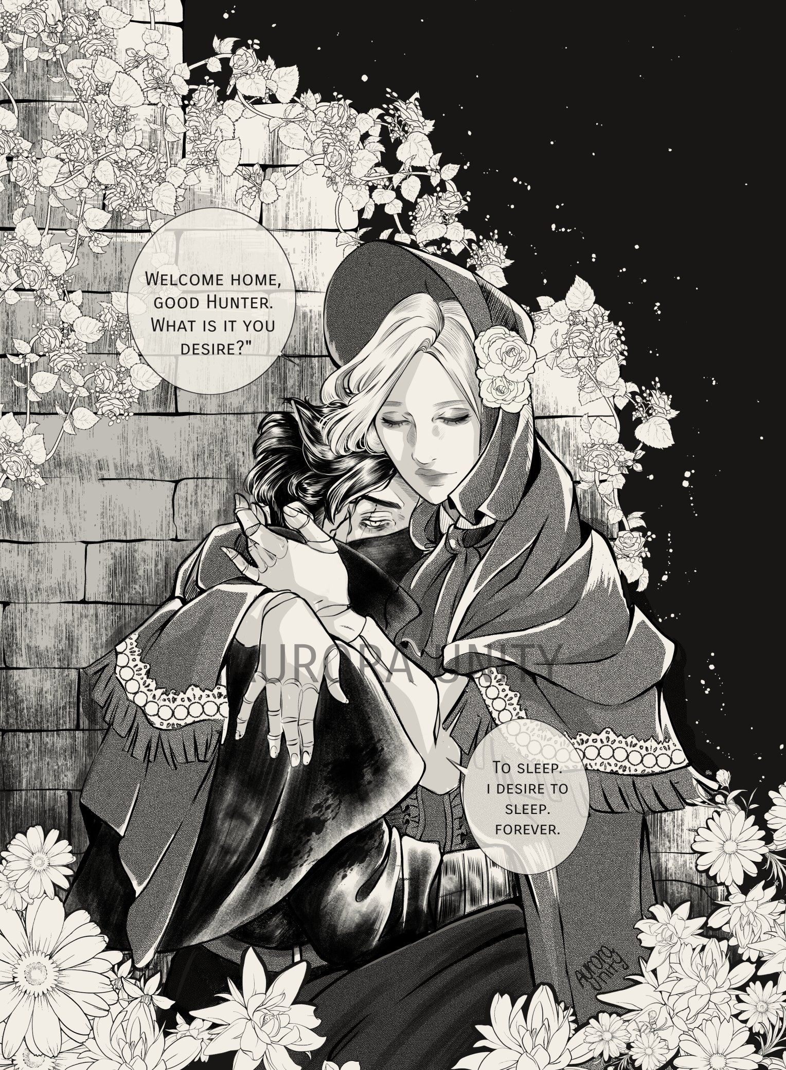 1boy 1girl artist_name aurora_unity bags_under_eyes bloodborne bonnet cloak closed_eyes commentary doll_joints english_commentary english_text flower half-closed_eye highres hug hunter_(bloodborne) joints monochrome missing_headwear plain_doll rose smile speech_bubble watermark