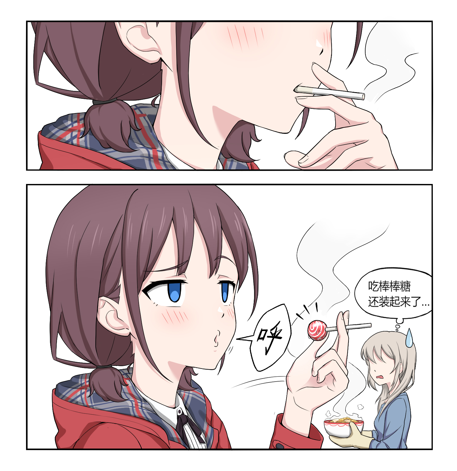 2girls anglediana blue_eyes blush bowl brown_hair candy chinese_commentary chinese_text commentary_request food girls_band_cry grey_hair highres holding holding_bowl holding_candy holding_food holding_lollipop hood hood_down hooded_jacket iseri_nina jacket kawaragi_momoka lollipop long_hair low_twintails multiple_girls oven_mitts red_jacket revision short_hair short_twintails sweat sweatdrop translation_request twintails