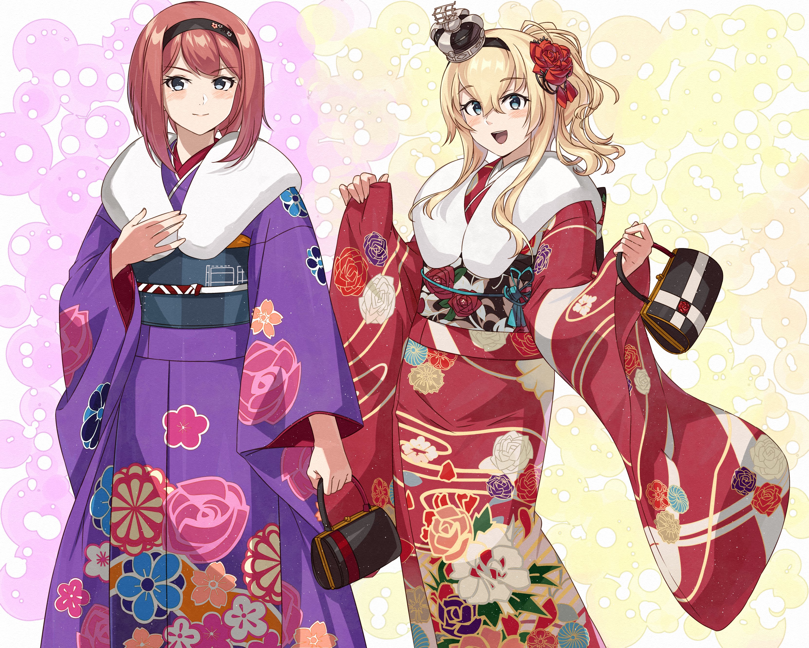 2girls absurdres ark_royal_(kancolle) ark_royal_(new_year)_(kancolle) black_hairband blonde_hair blue_eyes commentary commission crown floral_print flower hair_flower hair_ornament hairband highres japanese_clothes kanmiya_shinobu kantai_collection kimono looking_at_viewer mini_crown multiple_girls obi open_mouth ponytail purple_kimono red_flower red_hair red_kimono red_rose rose sash sidelocks simple_background skeb_commission tassel warspite_(kancolle) warspite_(new_year)_(kancolle) wide_sleeves
