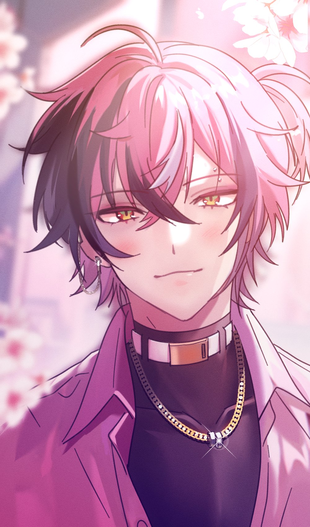1boy belt belt_buckle belt_collar black_hair black_shirt buckle cherry_blossoms closed_mouth collar collared_shirt commentary crossed_bangs doppio_dropscythe dot_nose ear_chain ear_piercing earrings english_commentary eyebrow_piercing face_piercing flower hair_between_eyes highres jacket jewelry linked_piercing male_focus multicolored_hair necklace nijisanji nijisanji_en open_clothes open_jacket orzmjxxx piercing pink_flower purple_hair purple_jacket shirt slit_pupils smile solo sparkle streaked_hair turtleneck upper_body virtual_youtuber white_belt wing_collar