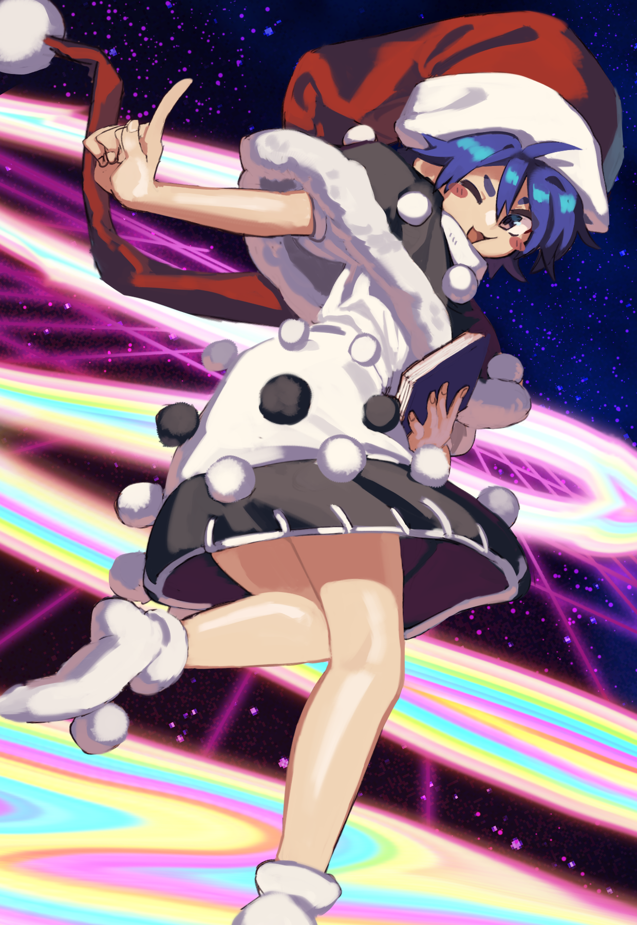 1girl blue_hair blush doremy_sweet dress full_body hat highres nightcap one_eye_closed open_mouth pom_pom_(clothes) red_hat short_sleeves socks solo touhou tuck_(tuck23978434) two-tone_dress white_dress white_socks
