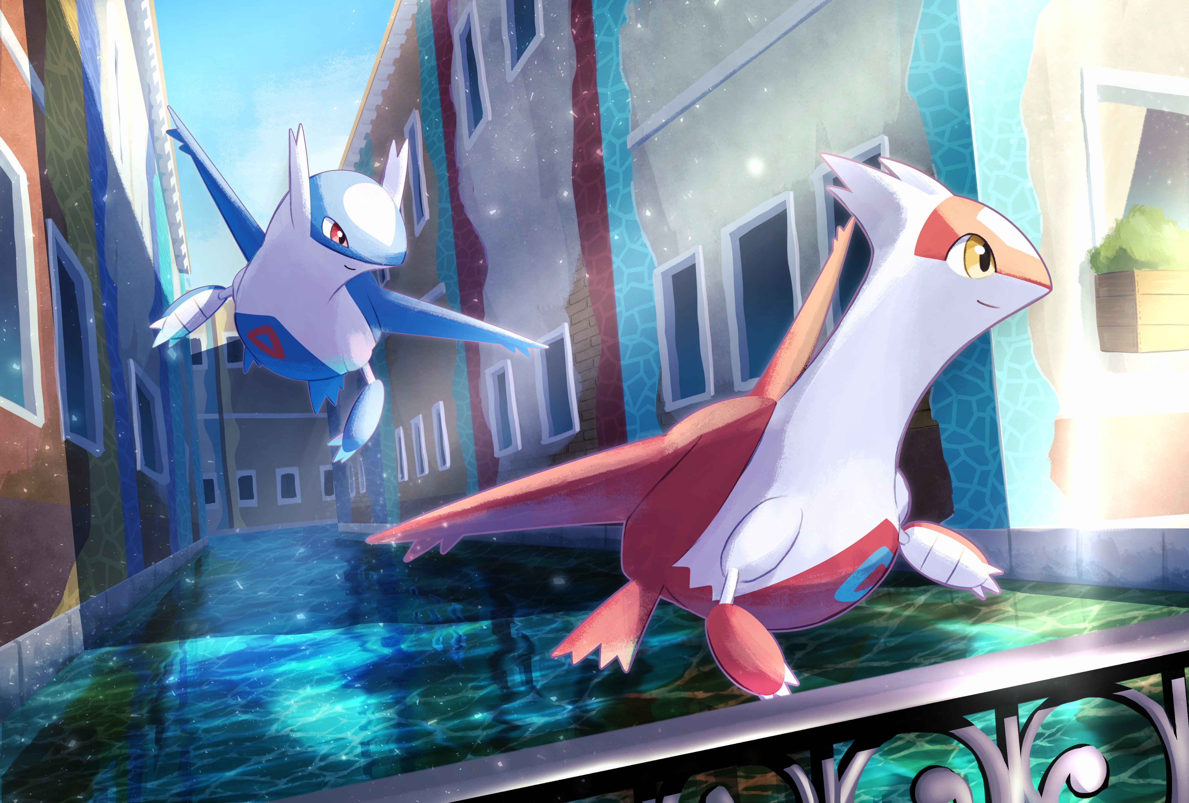 absurdres bird_tail canal claws closed_mouth commentary_request flying gen_3_pokemon hatoro_kuroyoshi highres latias latios legendary_pokemon nintendo no_humans outdoors pokemon pokemon_(creature) red_eyes smile tail water wings yellow_eyes