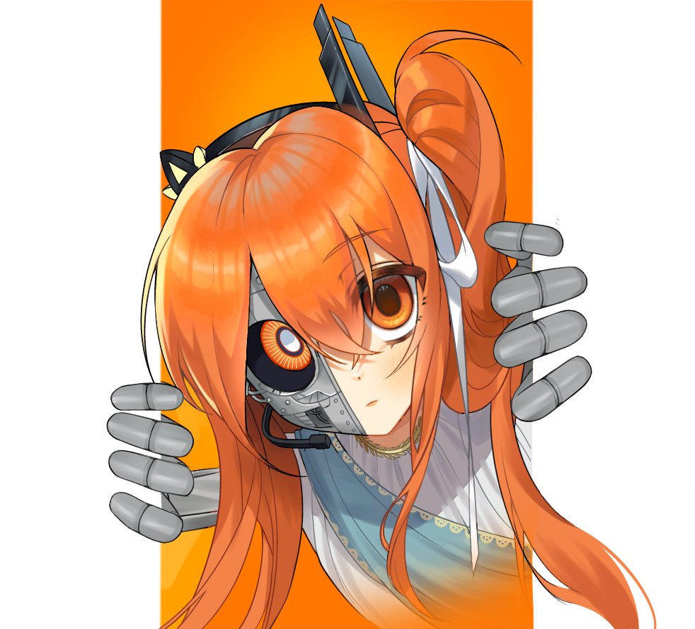 a.i._voice adachi_rei alternate_costume android arms_up dress hair_between_eyes hair_ribbon lips looking_at_viewer luciel_(lucielellis) machina_mori_(utau) mechanical_arms orange_eyes orange_hair pillarboxed radio ribbon second-party_source side_ponytail utau white_dress white_ribbon