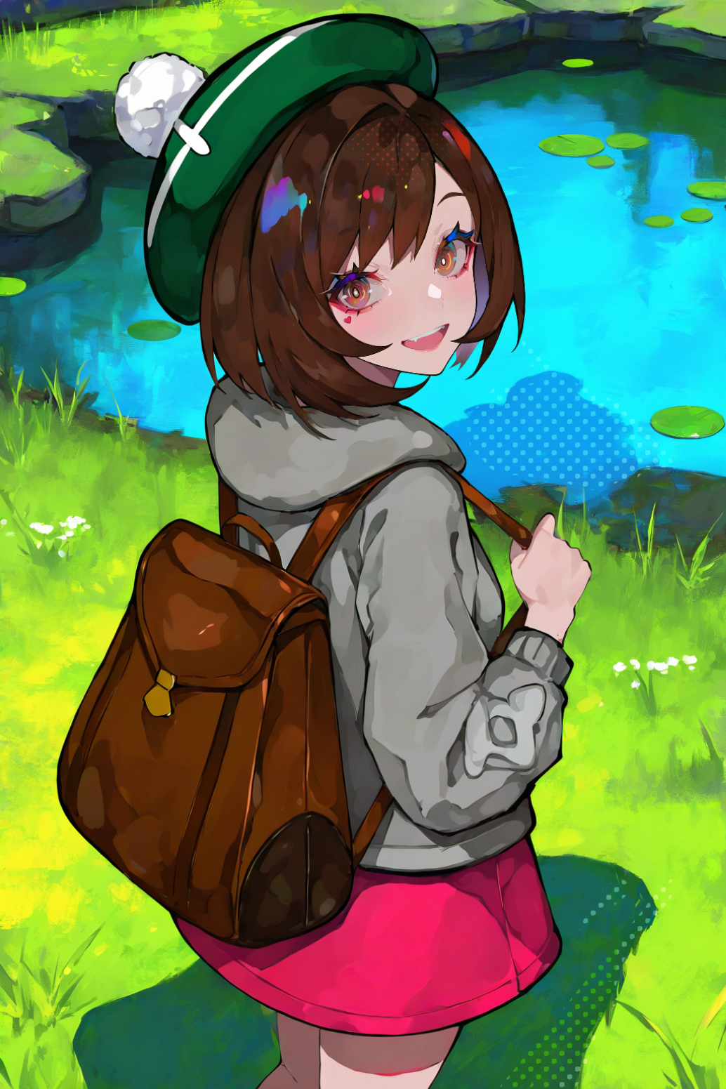 1girl ai-assisted bag brown_bag brown_eyes brown_hair cable_knit cardigan dress gloria_(pokemon) grass green_hat grey_cardigan hat heart heart_print highres holding holding_bag lake nintendo pink_dress pokemon pokemon_sword_and_shield short_hair tam_o'_shanter tor_(torkrub111)