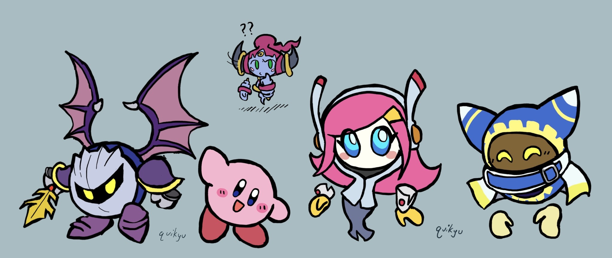 ? ?? armor bat_wings blue_eyes blush_stickers colored_skin crossover galaxia_(sword) gen_6_pokemon gloves hair_ornament hairclip highres holding holding_sword holding_weapon hoopa hoopa_(confined) horns kirby kirby_(series) legendary_pokemon magolor meta_knight mythical_pokemon nintendo pauldrons pink_hair pink_skin pokemon pokemon_(creature) quikyu rayman_limbs shoulder_armor signature susie_(kirby) sword weapon wings yellow_eyes yellow_gloves