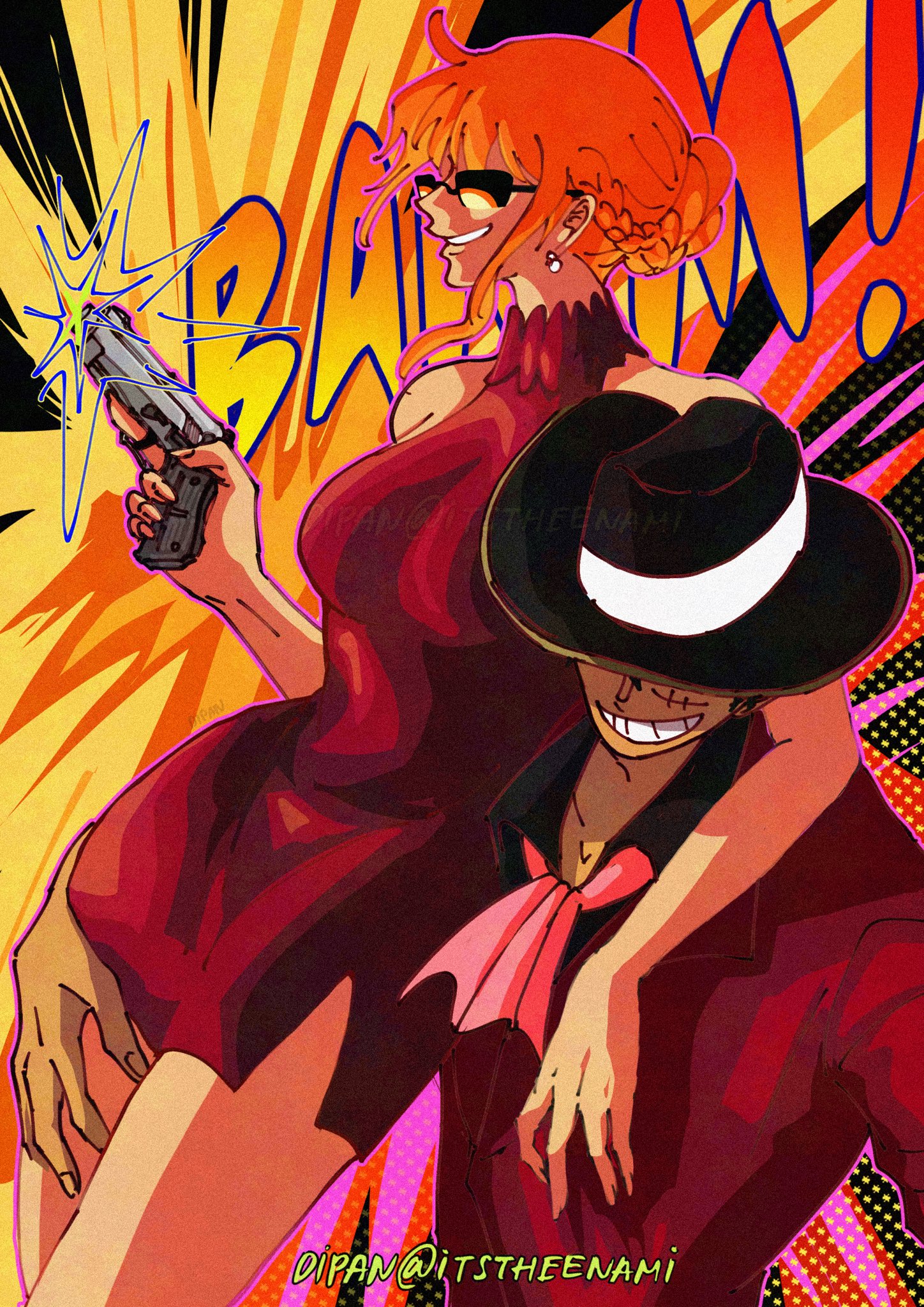 1boy 1girl arm_around_shoulder arm_around_waist bare_shoulders black_hair braid couple crown_braid curvy dress formal_clothes grin gun hat hat_over_eyes highres itstheenami long_hair monkey_d._luffy nami_(one_piece) nami_(one_piece)_(whole_cake_island) official_alternate_costume one_piece orange_hair red_dress red_shirt red_suit scar shirt short_hair sleeveless sleeveless_dress smile source_request straw_hat suit sunglasses weapon whole_cake_island_dress