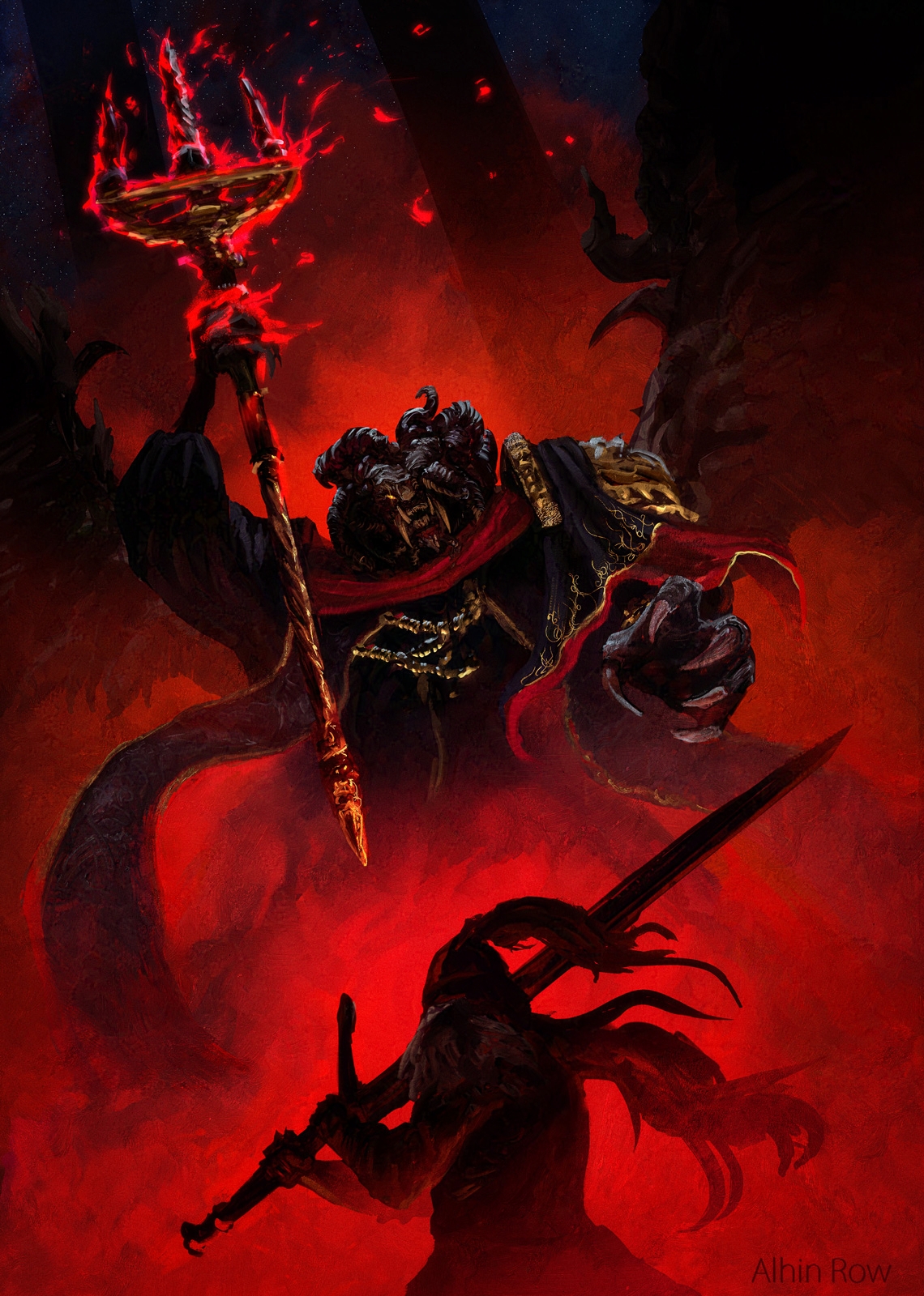 1boy 1other alhin_row armor asymmetrical_horns elden_ring fire flaming_weapon full_armor greatsword highres holding horns male_focus mismatched_horns missing_eye mohg_lord_of_blood multiple_horns ornate_clothes polearm robe sharp_teeth stole sword tarnished_(elden_ring) teeth trident weapon yellow_eyes