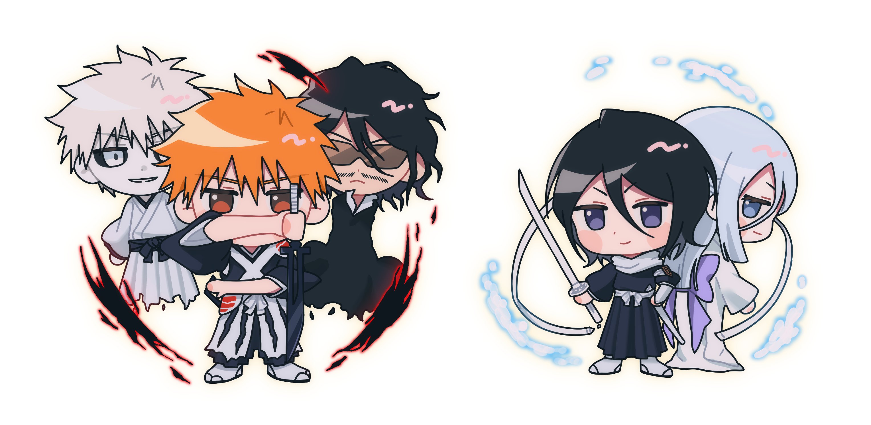 >:) 2girls 3boys armor back_bow black_hair black_hakama black_kimono black_sclera bleach bleach:_sennen_kessen-hen bleach:_zanpakutou_ibun_hen blue_eyes blush_stickers bow brown_eyes chibi chibi_only closed_mouth colored_sclera commentary double-parted_bangs dual_wielding facial_hair floating full_body gwao_(_ul_13) hair_between_eyes hakama hand_on_own_hip highres holding holding_sword holding_weapon hollow_ichigo japanese_clothes katana kimono korean_commentary kuchiki_rukia kurosaki_ichigo long_hair long_sleeves looking_at_viewer medium_hair multiple_boys multiple_girls orange_hair parted_lips purple_bow purple_eyes scarf shikai short_hair shoulder_armor simple_background smile sode_no_shirayuki sode_no_shirayuki_(shikai) spiked_hair standing stubble sunglasses sword true_zangetsu_(shikai) v-shaped_eyebrows weapon white_background white_eyes white_hair white_kimono white_scarf wide_sleeves zangetsu_(bleach)