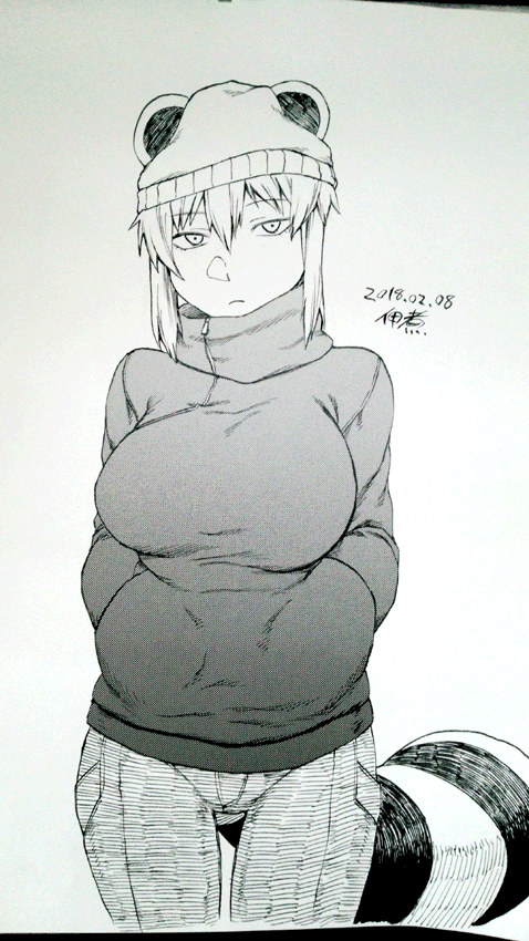 1girl animal_ears araiguma-san beanie breasts closed_mouth cowboy_shot dated hair_between_eyes hat large_breasts long_sidelocks long_sleeves looking_at_viewer monochrome original pants raccoon_ears raccoon_girl raccoon_tail short_hair sidelocks signature simple_background solo sweater tail thigh_gap thighs tsukudani_(coke-buta) white_background winter_clothes