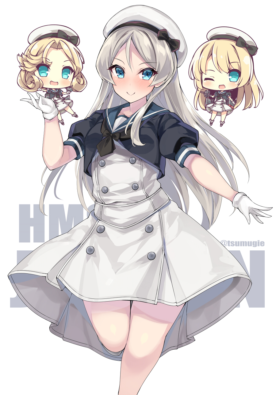 3girls akikaze_tsumuji black_neckerchief blonde_hair blue_eyes blue_sailor_collar blush character_name chibi commentary dress gloves grey_hair hat highres janus_(kancolle) javelin_(kancolle) jervis_(kancolle) kantai_collection long_hair multiple_girls neckerchief one_eye_closed open_mouth sailor_collar sailor_dress short_sleeves simple_background smile solo_focus twitter_username white_background white_dress white_gloves white_hat