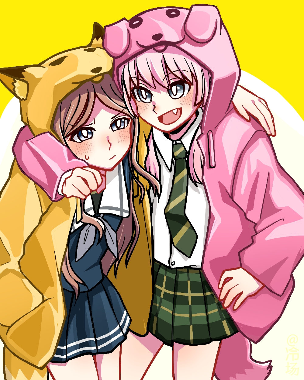 2girls animal_ears arm_around_neck bang_dream! bang_dream!_it's_mygo!!!!! blue_eyes blue_shirt blue_skirt blush brown_hair chihaya_anon chinese_commentary closed_mouth collared_shirt commentary_request dog_ears dog_tail dress_shirt fake_tail fang fox_ears fox_tail green_skirt grey_eyes grey_neckerchief haneoka_school_uniform highres hood hood_up hooded_jacket jacket len_2002 long_hair multiple_girls nagasaki_soyo neckerchief open_mouth pink_hair pink_jacket plaid_clothes plaid_skirt pleated_skirt school_uniform shirt skirt tail tsukinomori_school_uniform white_shirt yellow_jacket