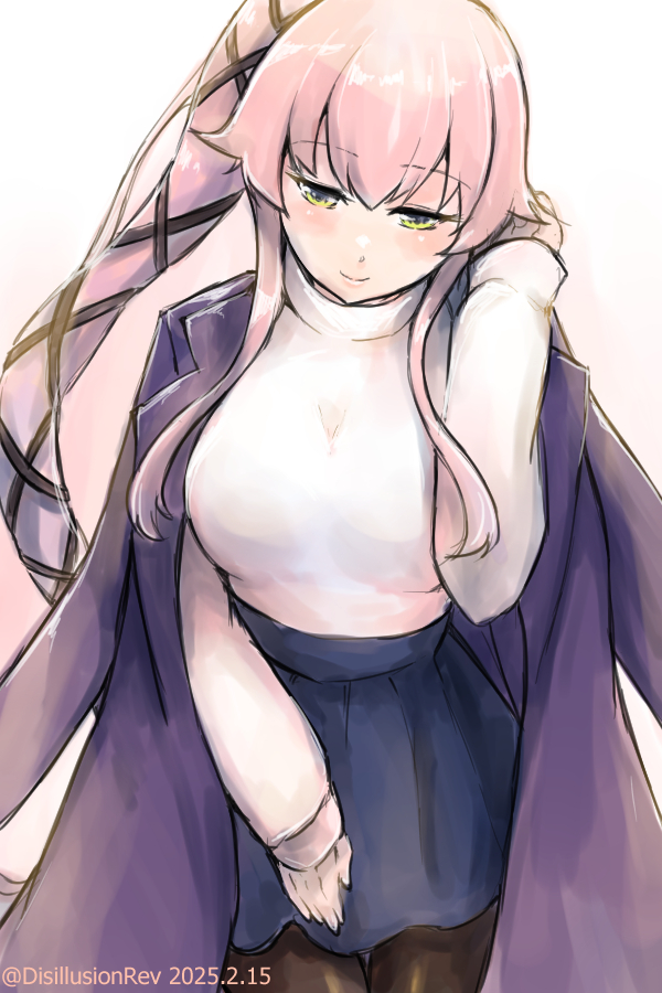 1girl black_pantyhose black_ribbon black_skirt dated green_eyes hair_ribbon jacket jacket_on_shoulders kamio_(d-rev) kantai_collection long_hair long_sleeves looking_down one-hour_drawing_challenge pantyhose pink_hair ponytail ribbon simple_background skirt smile solo sweater turtleneck turtleneck_sweater twitter_username very_long_hair white_background white_sweater yura_(kancolle) yura_(maizuru)_(kancolle)