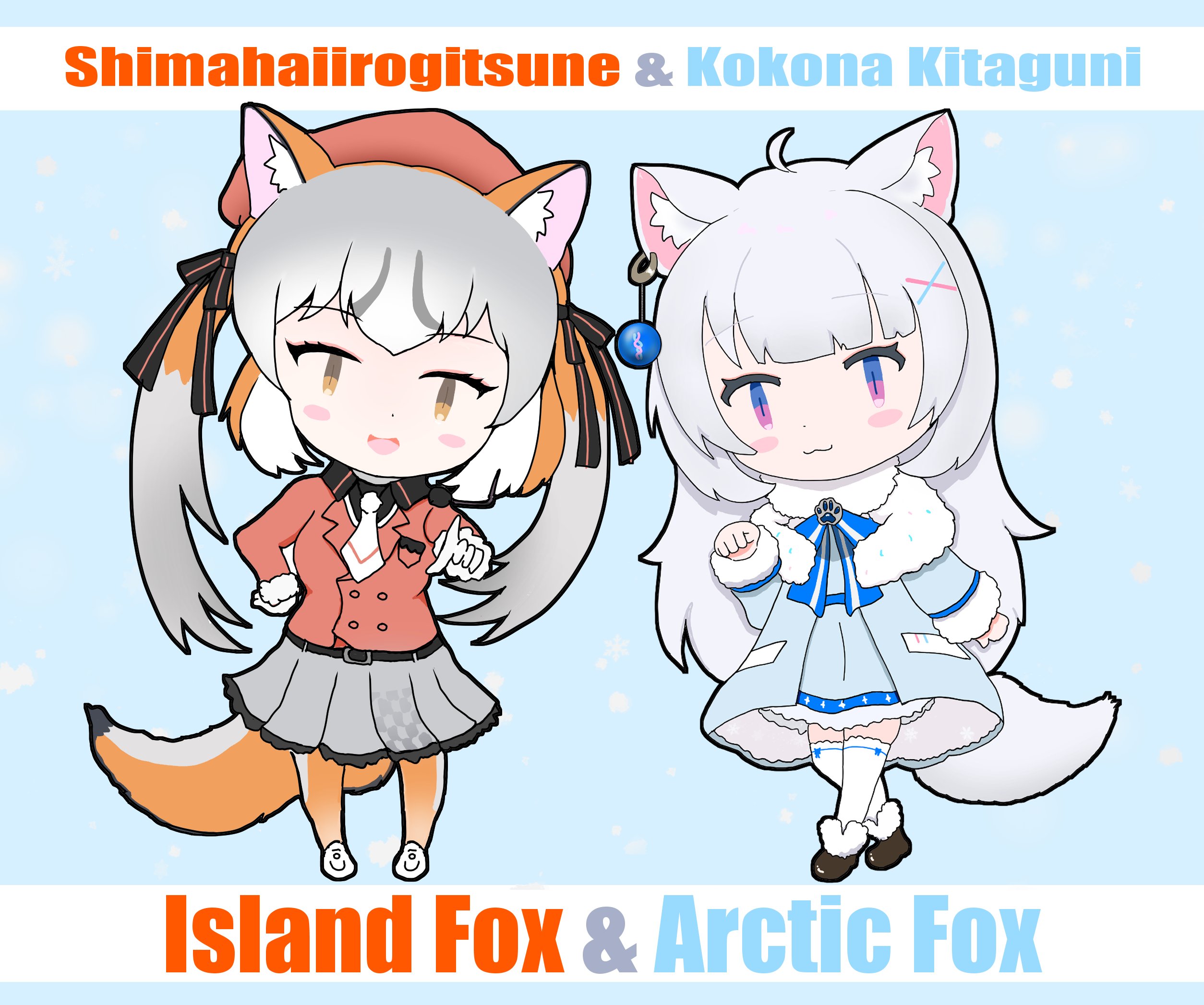 2girls animal_ears belt blue_background blue_eyes bow bowtie brown_hair coat extra_ears fox_ears fox_girl fox_tail gloves grey_hair hair_ornament hat highres indie_virtual_youtuber island_fox_(kemono_friends) jacket kemono_friends kemono_friends_v_project kitaguni_kokona long_hair looking_at_viewer mo_cha_chi multiple_girls necktie pantyhose ribbon shirt shoes simple_background skirt tail thighhighs virtual_youtuber yellow_eyes