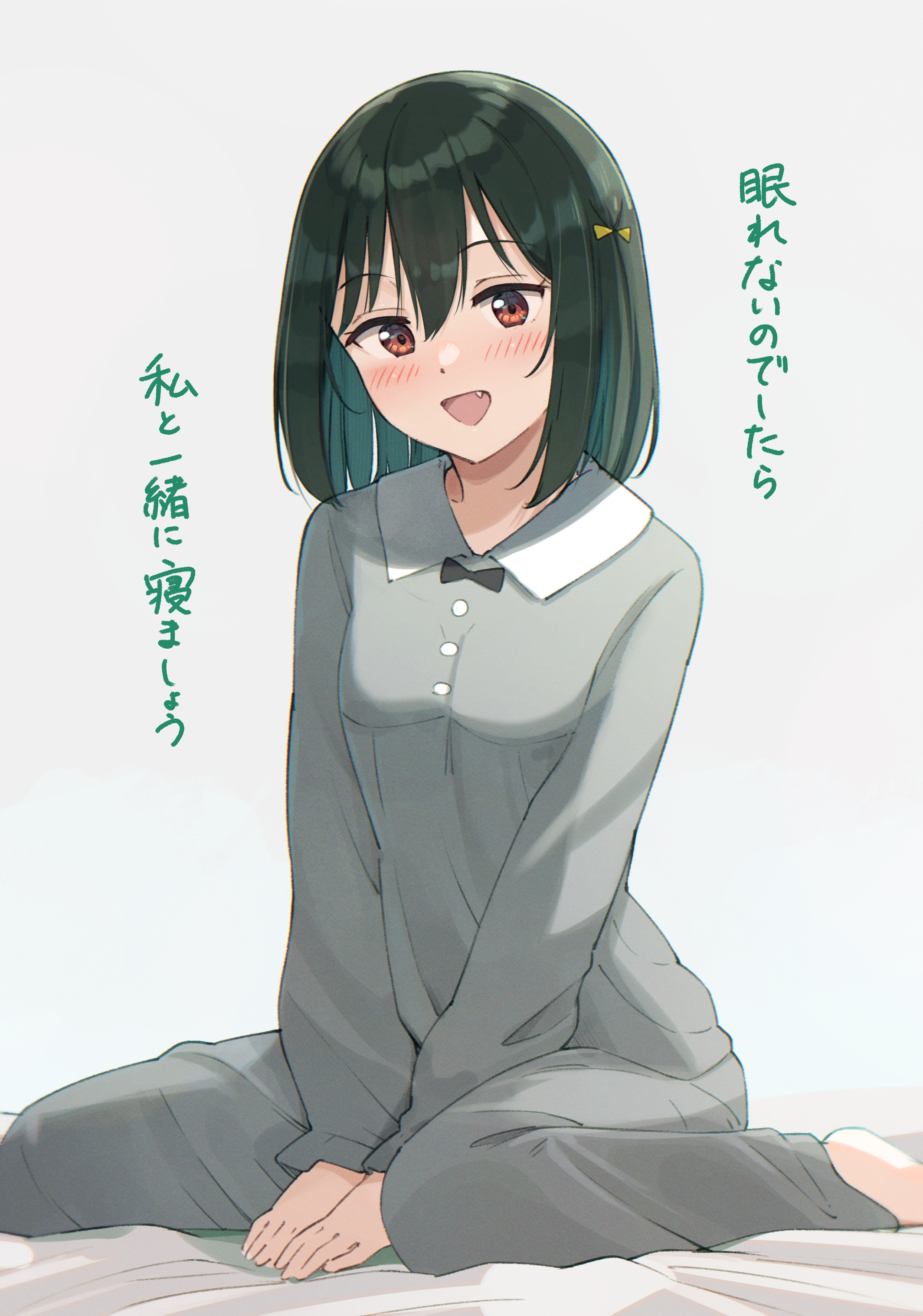 1girl absurdres bed_sheet blush commentary_request fang green_hair grey_pajamas hair_between_eyes hair_ribbon highres long_sleeves looking_at_viewer love_live! love_live!_nijigasaki_high_school_idol_club mifune_shioriko open_mouth pajamas red_eyes ribbon short_hair sitting solo tata_(tataice) translation_request wariza white_background yellow_ribbon