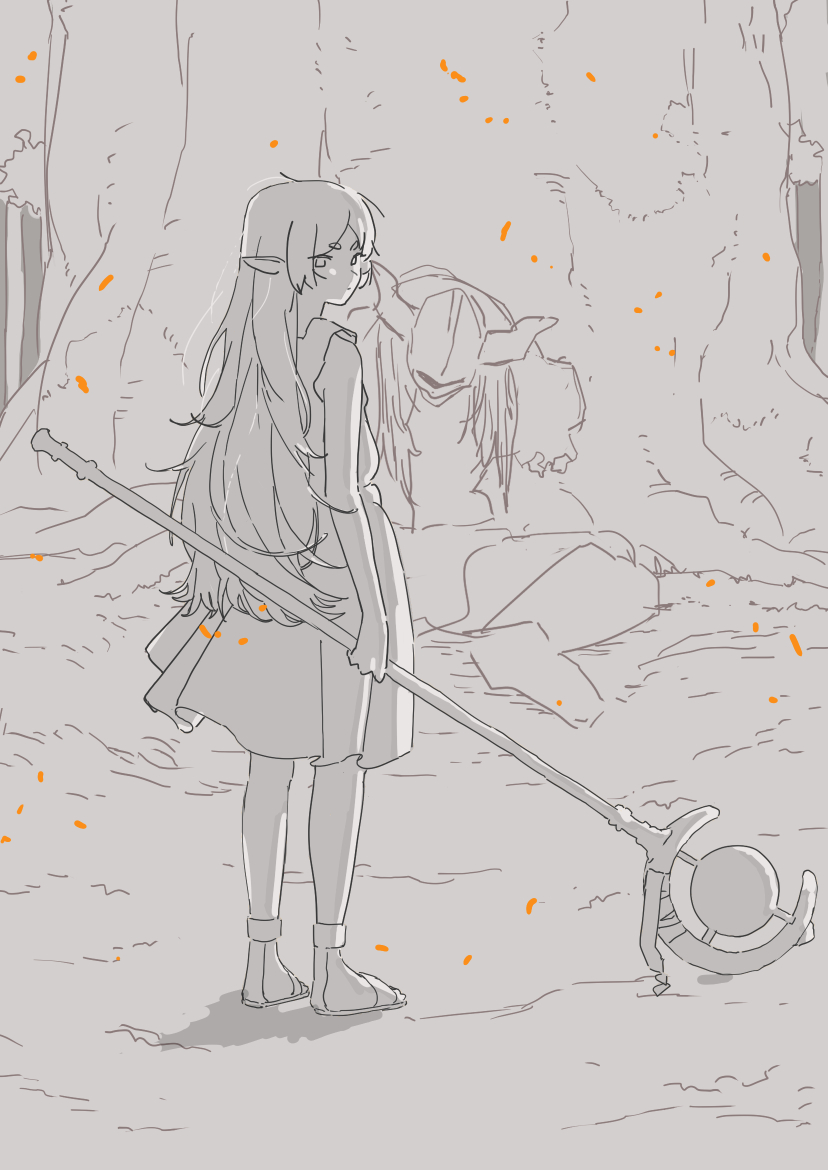1girl closed_mouth dress frieren full_body greyscale holding holding_staff ikafinity long_hair looking_at_viewer monochrome pointy_ears sandals sidelocks sleeveless sleeveless_dress solo sousou_no_frieren staff tree very_long_hair