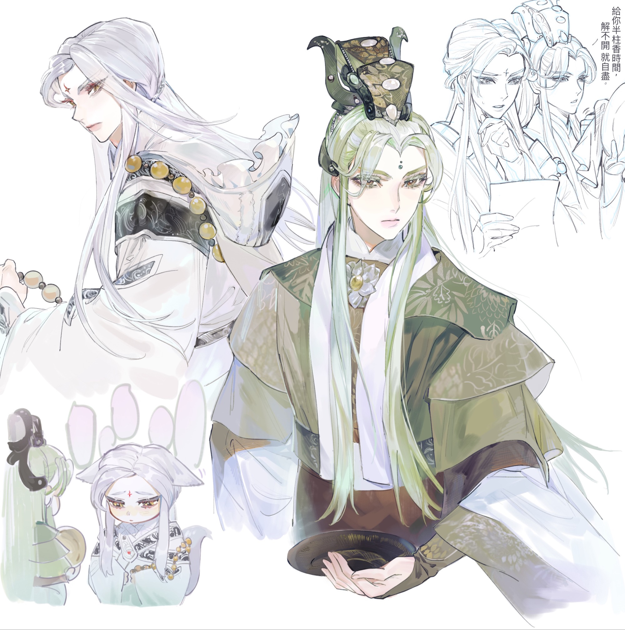 2boys animal_ears chibi chinese_clothes chinese_text closed_mouth curtained_hair facial_mark fenrongjiao flower forehead_jewel from_side green_hair green_hanfu green_sleeves hanfu highres holding holding_paper jinguang_budaixi long_sidelocks long_sleeves looking_ahead looking_at_viewer looking_down male_focus mo_cangli monster_boy multiple_boys multiple_views paper parted_bangs partially_colored qiao_rulai sidelocks sleeves_past_wrists tail upper_body very_long_sidelocks white_flower white_hair white_hanfu white_sleeves widow's_peak xiao_guan_(headdress) yellow_eyes