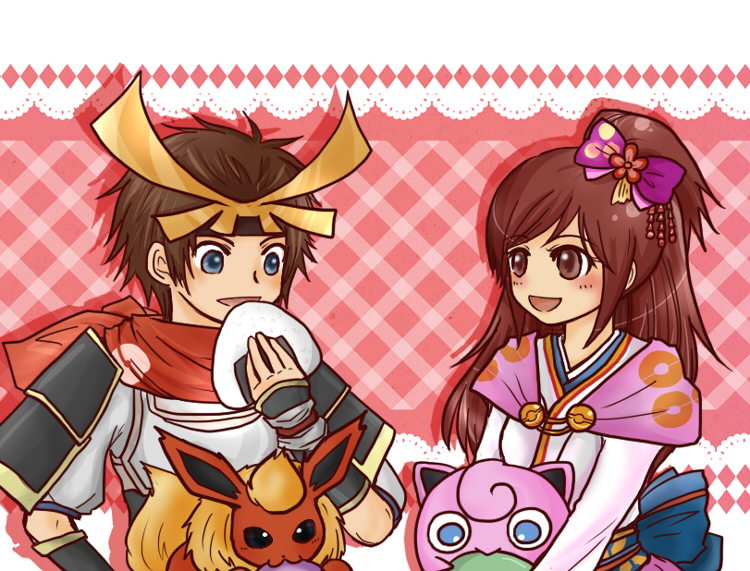 armor blue_eyes blush brown_eyes brown_hair flareon food gen_1_pokemon headdress hero_(pokemon_conquest) holding holding_pokemon japanese_clothes jigglypuff kimono long_hair looking_at_another nintendo obi oichi_(pokemon_conquest) oichi_(sengoku_musou) onigiri parted_bangs pokemon pokemon_(creature) pokemon_conquest ponytail red_scarf sash scarf sengoku_musou smile swept_bangs