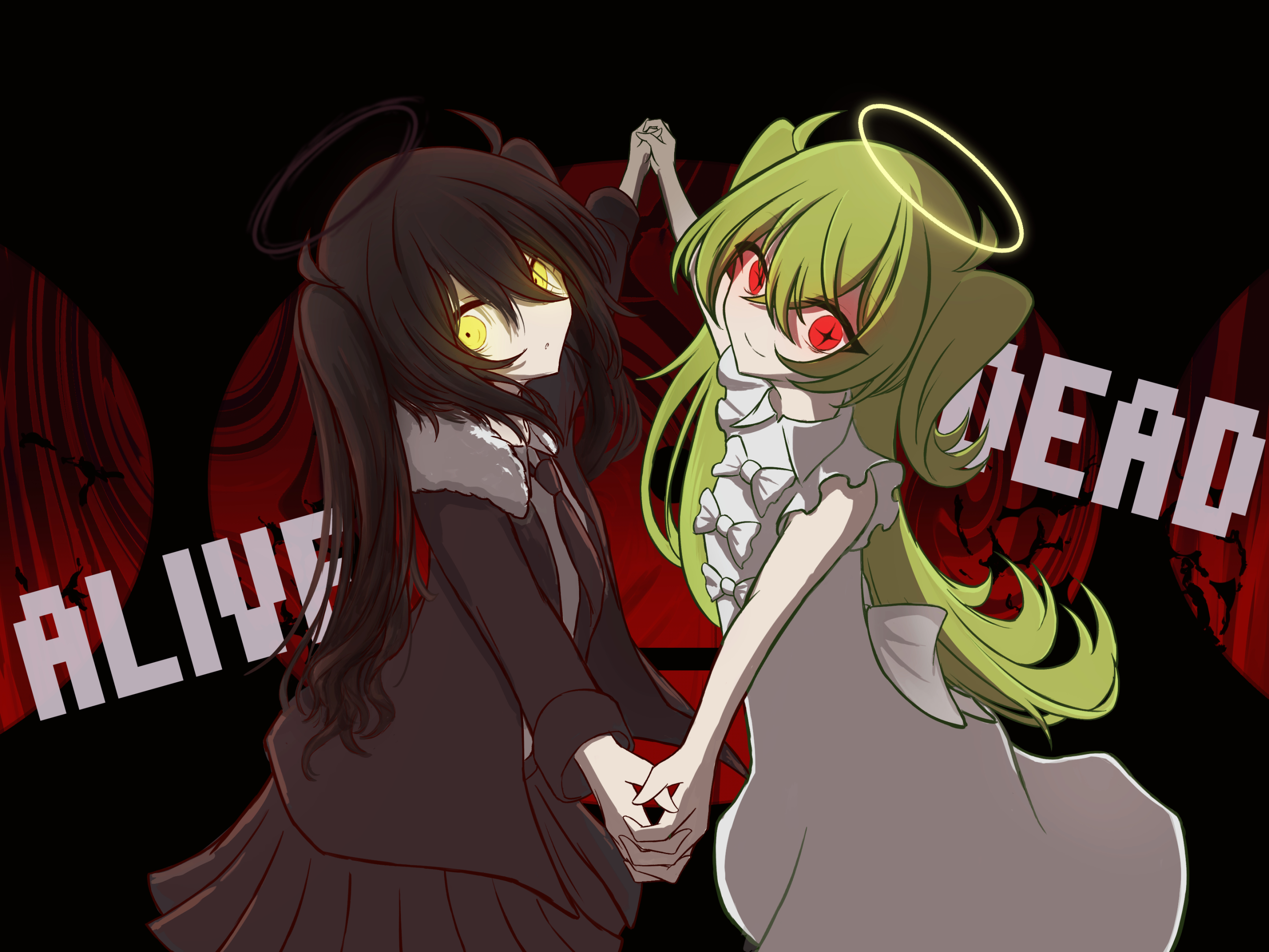 2girls black_hair black_halo black_jacket black_shirt blonde_hair bow closed_mouth collared_dress cross-shaped_pupils crossed_bangs dancing dress expressionless fur-trimmed_jacket fur_trim glowing glowing_eyes grey_shirt hair_between_eyes halo highres holding_hands interlocked_fingers jacket long_hair long_sleeves looking_at_viewer multiple_girls open_clothes open_jacket original parted_lips pleated_skirt red_eyes shirt skirt sleeveless sleeveless_dress smile symbol-shaped_pupils tententengokujigokugoku_(aiobahn) torufe two_side_up very_long_hair waist_bow white_bow white_dress yellow_eyes yellow_halo
