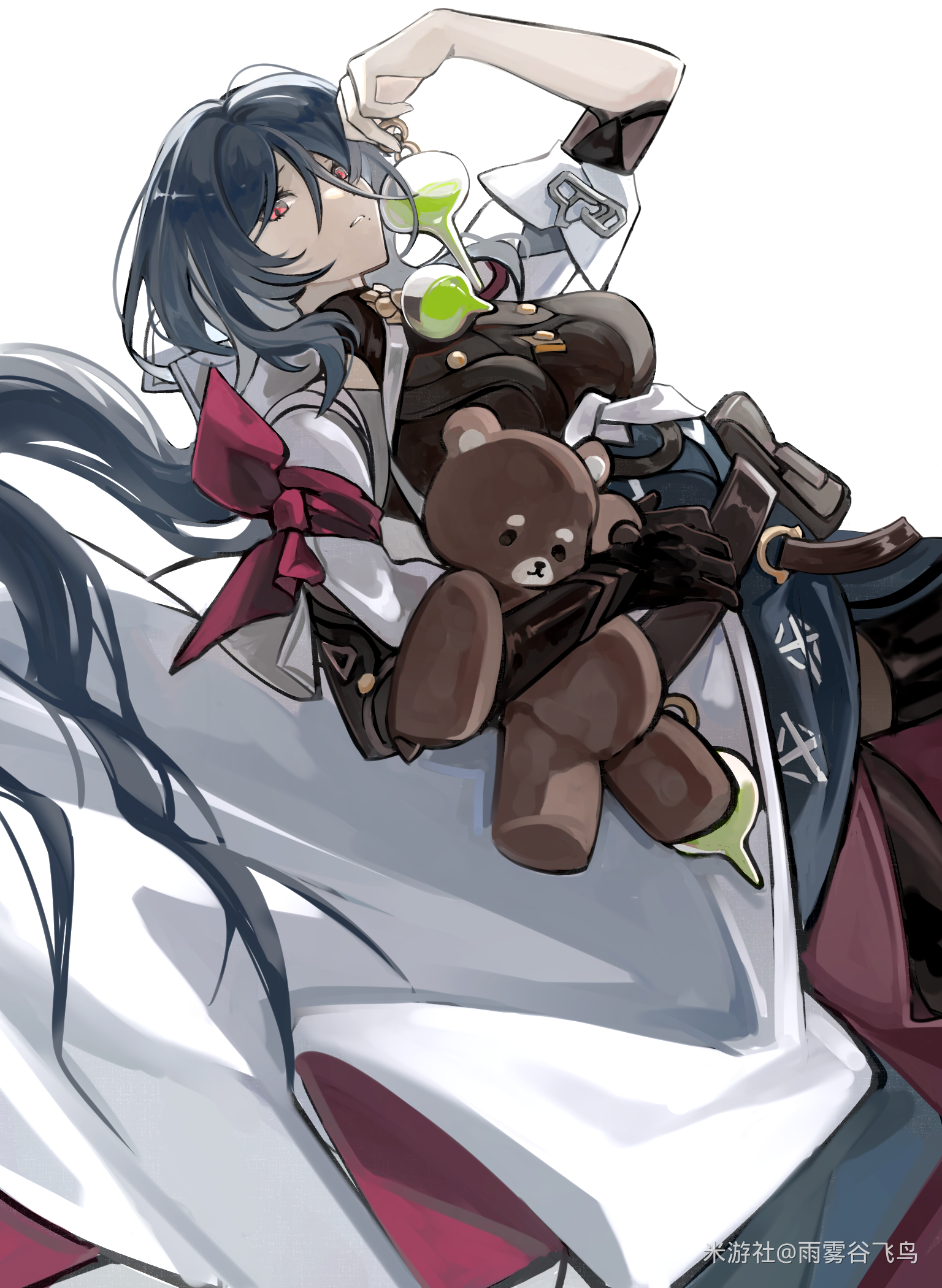 1girl artist_request black_gloves black_hair breasts cleavage elbow_gloves gloves grey_background hair_between_eyes highres holding holding_toy honkai:_star_rail honkai_(series) lab_coat long_hair looking_at_viewer lying mole mole_under_mouth natasha_(honkai:_star_rail) ponytail red_eyes simple_background single_elbow_glove single_glove solo stuffed_animal stuffed_toy teddy_bear toy very_long_hair
