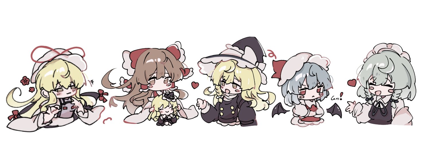 5girls :3 bat_wings black_shirt blonde_hair blue_hair blush bow braid brown_eyes brown_hair closed_eyes detached_sleeves dress grey_hair hair_between_eyes hakurei_reimu hat heart izayoi_sakuya kerukero1341 kirisame_marisa long_hair long_sleeves maid_headdress medium_hair mob_cap multiple_girls purple_tabard red_bow red_eyes red_shirt remilia_scarlet shirt short_sleeves smile tabard touhou twin_braids upper_body vampire white_background white_dress wings witch_hat yakumo_yukari yellow_eyes
