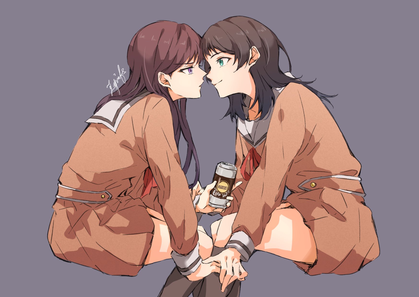 2girls aiiro_bokujuu bang_dream! bang_dream!_it's_mygo!!!!! black_hair brown_hair brown_serafuku can eye_contact face-to-face from_side green_eyes grey_background hanasakigawa_school_uniform hand_on_another's_hand highres holding holding_can invisible_chair long_hair long_sleeves looking_at_another medium_hair miniskirt multiple_girls neck_ribbon pleated_skirt purple_eyes red_ribbon ribbon sailor_collar school_uniform serafuku shiina_taki signature simple_background sitting skirt white_sailor_collar yahata_umiri yuri