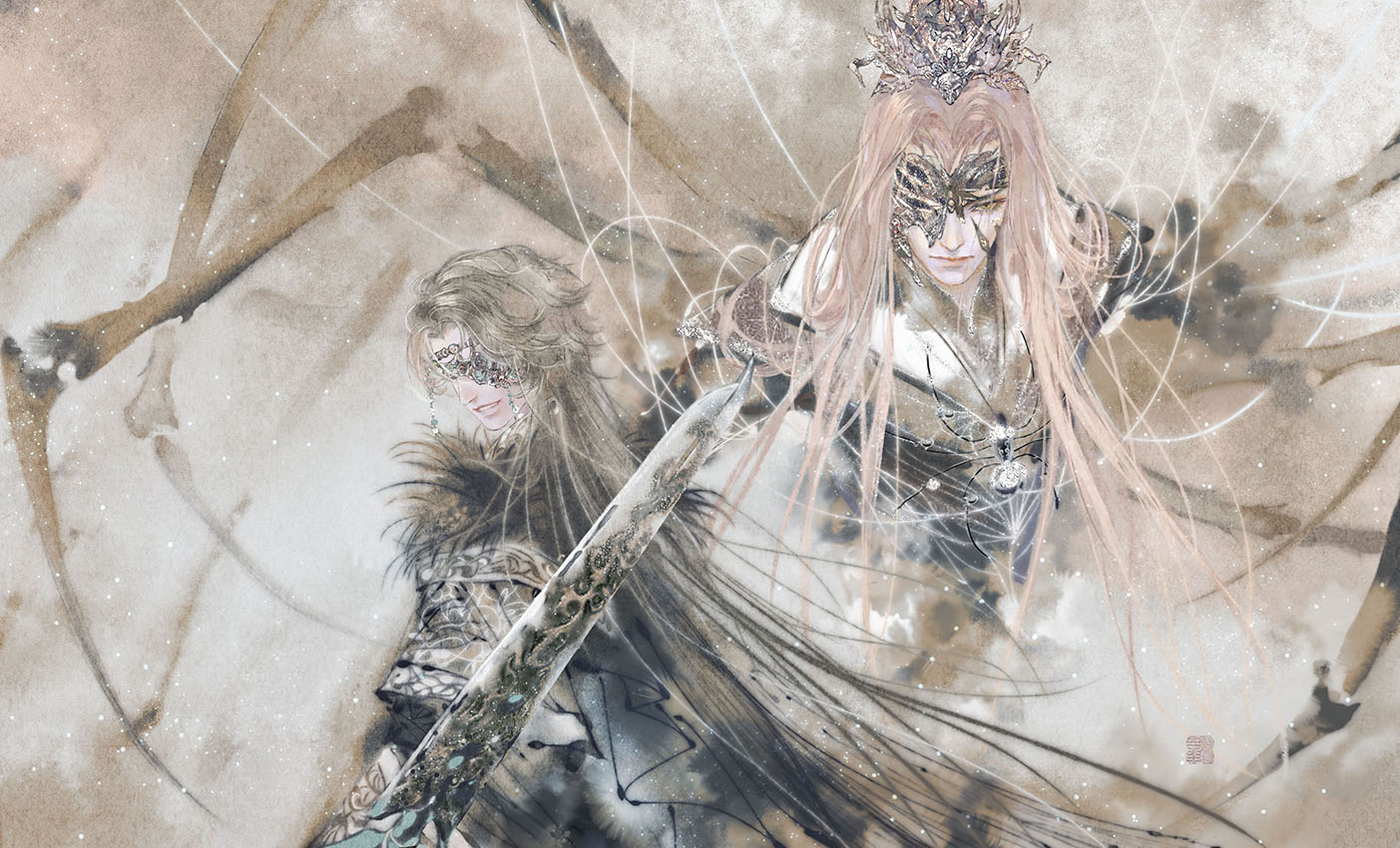 2boys armor blonde_hair bone brown_hair bug cape chinese_clothes closed_mouth cropped_torso floating_hair fransbell from_side gem half_mask hanfu jewelry jinguang_budaixi light_particles limited_palette long_hair looking_to_the_side lushi_moluo male_focus mask multiple_boys patterned_clothing smile spider straight-on sword upper_body very_long_hair wang_zhongren weapon white_hanfu xiao_guan_(headdress) yellow_eyes