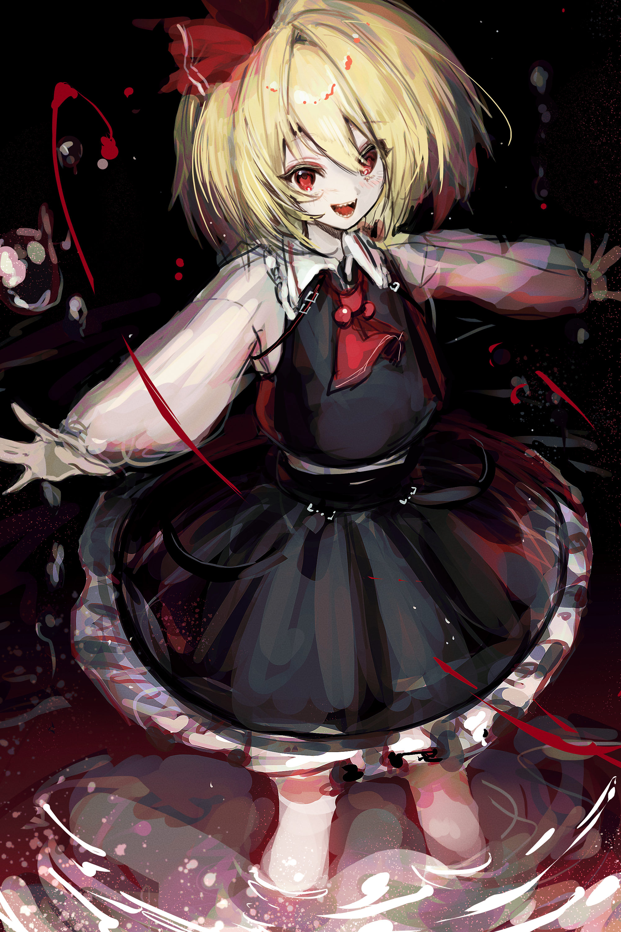 1girl absurdres ascot bad_id bad_pixiv_id black_skirt black_vest blonde_hair collared_shirt dark_background darkness feet_out_of_frame frilled_shirt_collar frilled_skirt frills hair_between_eyes highres long_sleeves medium_hair open_mouth piz_doll puffy_long_sleeves puffy_sleeves red_ascot red_eyes rumia sharp_teeth shirt simple_background skirt skirt_set solo t-pose teeth touhou vest white_shirt