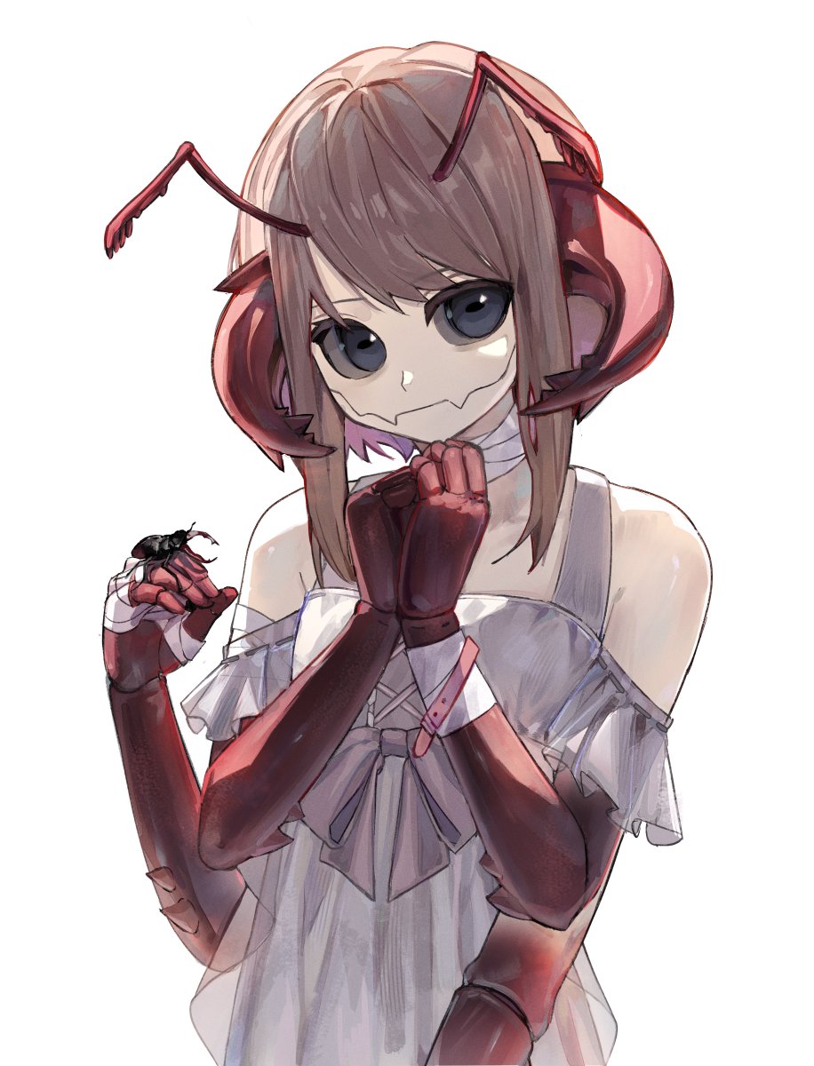 1girl antennae arthropod_girl bandaged_hand bandaged_neck bandages bare_shoulders beetle beetle_girl brown_hair bug carapace commentary dress english_commentary extra_arms grey_eyes highres indie_virtual_youtuber insect long_sidelocks looking_at_viewer mandibles medium_hair monster_girl own_hands_together sidelocks simple_background sleeveless sleeveless_dress solo tilltired upper_body vesper_(vtuber) virtual_youtuber white_background white_dress