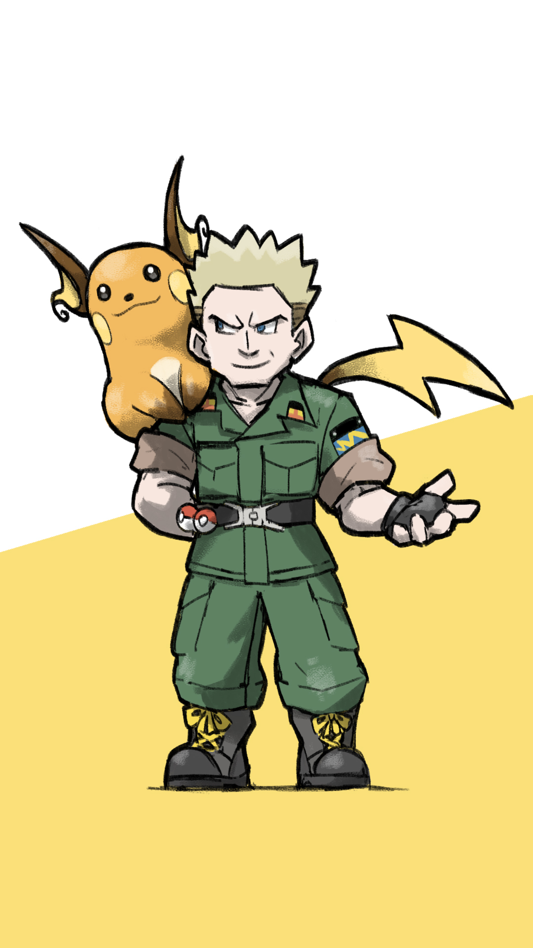 1boy :3 belt black_belt black_boots black_gloves blacknirrow blonde_hair blue_eyes boots closed_mouth commentary english_commentary fingerless_gloves gen_1_pokemon gloves green_pants green_shirt highres nintendo on_shoulder pants poke_ball poke_ball_(basic) pokemon pokemon_(creature) pokemon_lgpe pokemon_on_shoulder raichu shirt short_hair short_sleeves simple_background smile spiked_hair lt._surge two-tone_background white_background yellow_background