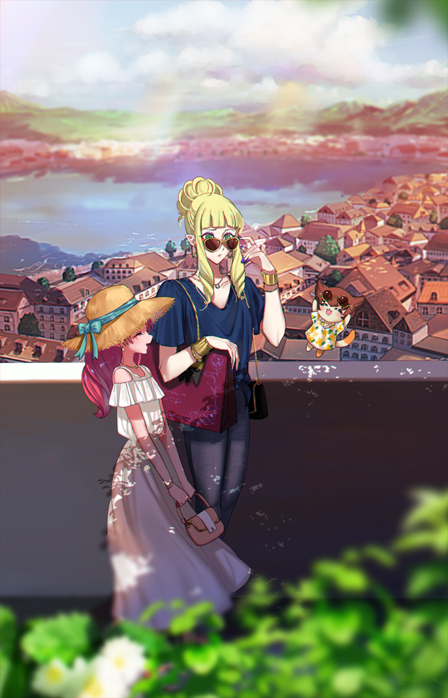 1boy 1girl akagi_towa black_pants blonde_hair blue_shirt brown_bag brown_hat building closed_eyes cloud dress earrings go!_princess_precure green_eyes hair_bun hat jewelry lake long_hair mountainous_horizon necklace open_mouth pants pointy_ears precure red_hair shirt short_hair short_hair_with_long_locks shut_(precure) single_hair_bun sky smile straw_hat town white_dress wrist_cuffs