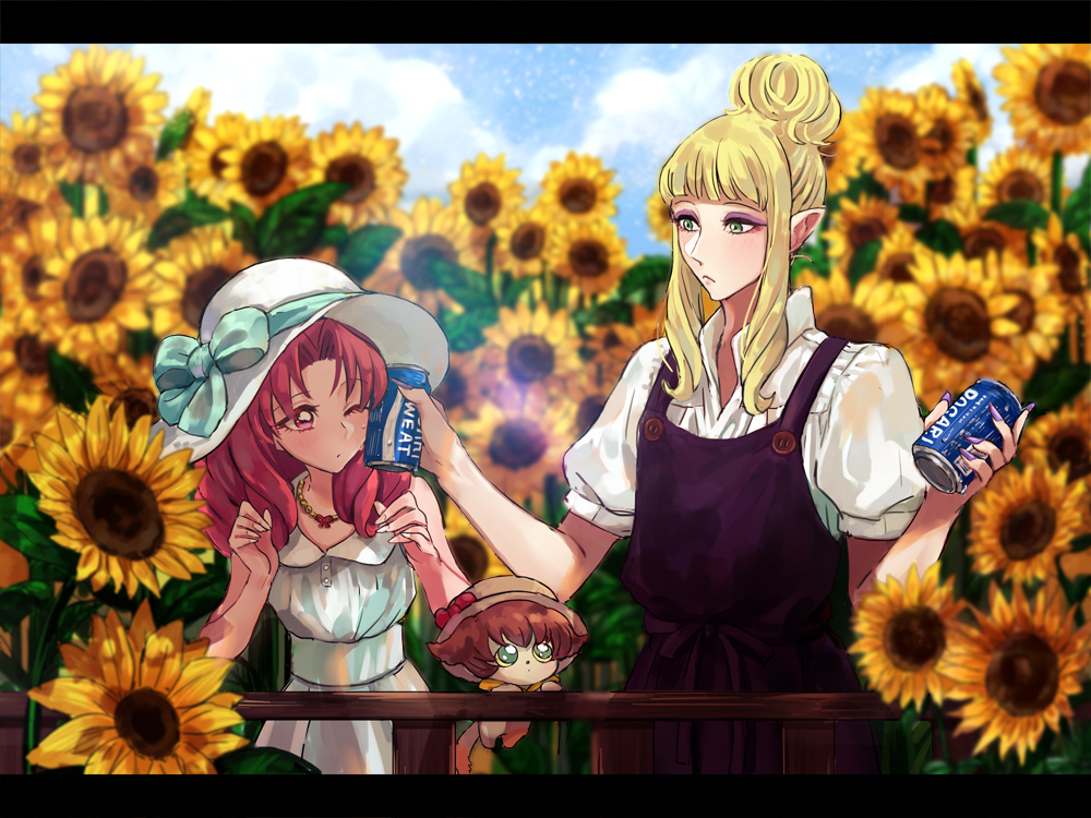 1boy 1girl akagi_towa bad_id black_dress blonde_hair cloud dress drink field flower flower_field go!_princess_precure green_eyes hair_bun hat holding holding_drink jewelry long_hair mohemohemincho necklace one_eye_closed pocari_sweat pointy_ears precure red_eyes red_hair shirt short_hair_with_long_locks short_sleeves shut_(precure) single_hair_bun sky sleeveless sleeveless_dress sunflower sunflower_field white_dress white_hat white_shirt
