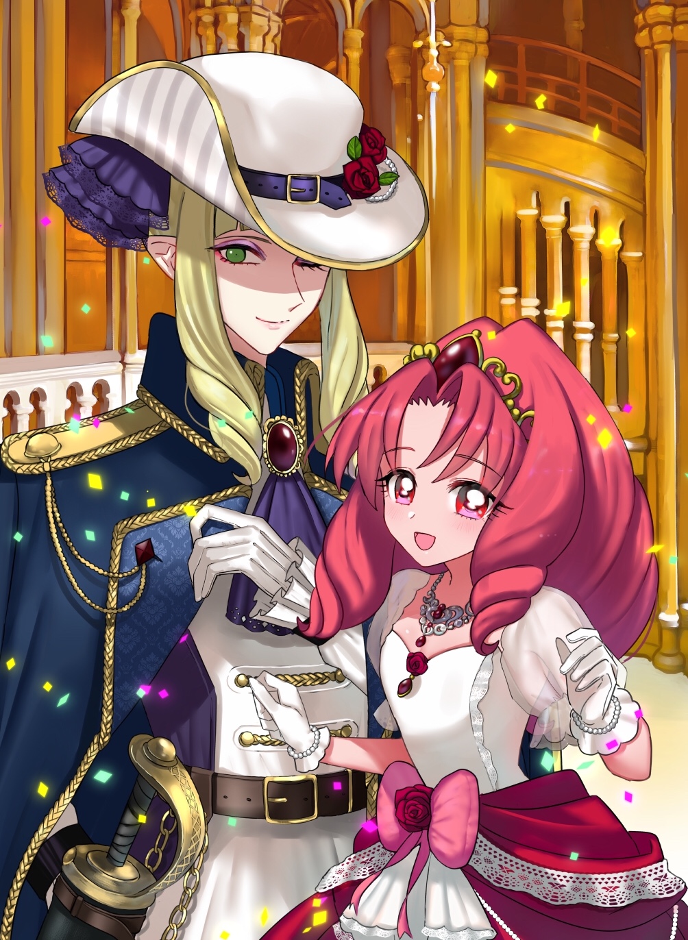 1boy 1girl akagi_towa bad_id belt black_belt blonde_hair blue_jacket blush closed_mouth confetti dress gloves go!_princess_precure green_eyes hat highres jacket jewelry long_hair long_sleeves mohemohemincho necklace open_mouth pointy_ears precure red_eyes red_hair short_hair_with_long_locks shut_(precure) smile sword tiara two-tone_dress weapon white_dress white_gloves white_hat