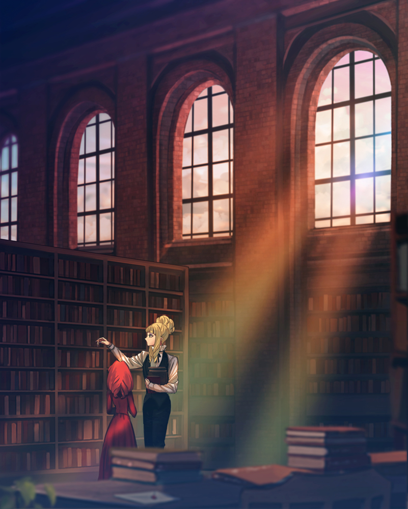 1boy 1girl akagi_towa bad_id black_pants black_vest blonde_hair book bookshelf dress go!_princess_precure green_eyes hair_bun holding holding_book library long_hair long_sleeves mohemohemincho pants plant pointy_ears precure red_dress red_hair shirt short_hair_with_long_locks shut_(precure) single_hair_bun sunlight table vest white_shirt window