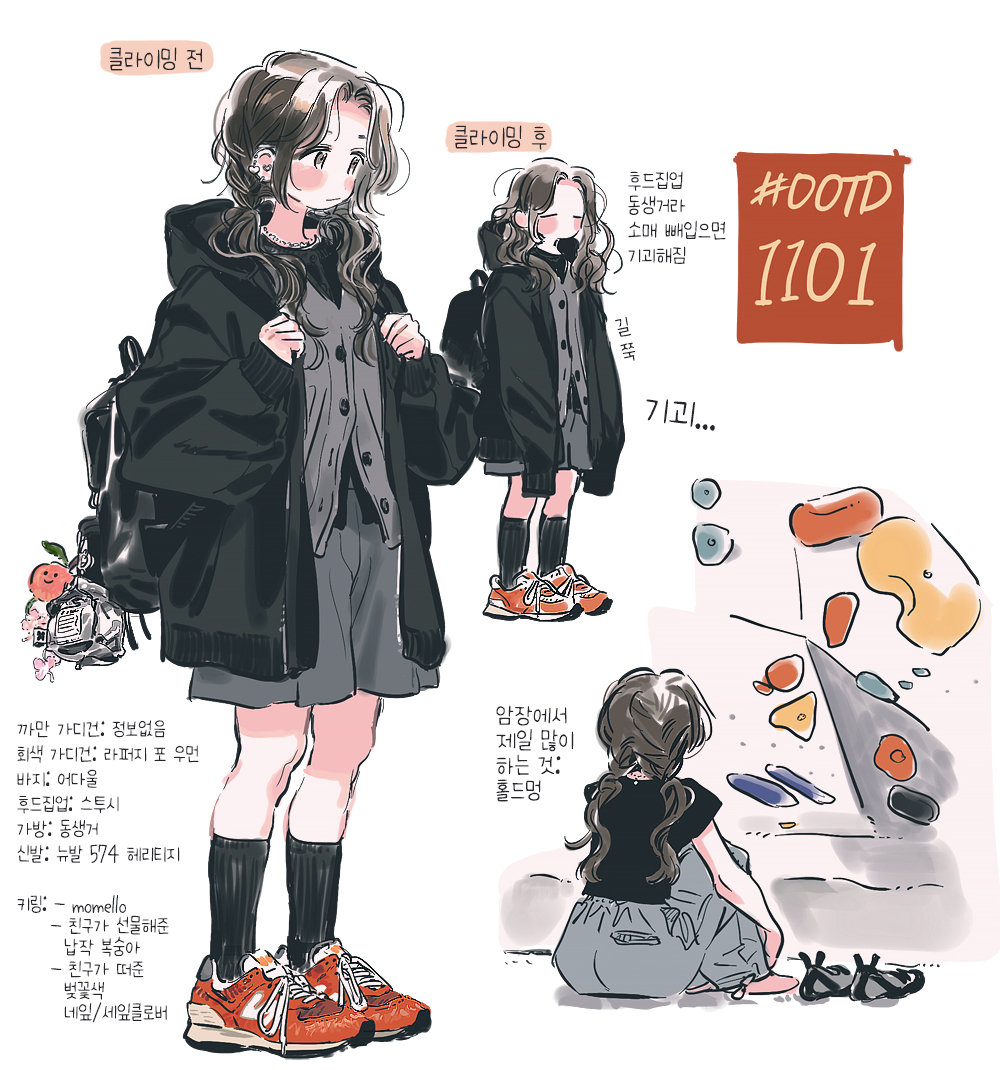 1girl backpack bag bangoul black_hoodie black_socks hoodie korean_text multiple_views original sandals sitting socks standing