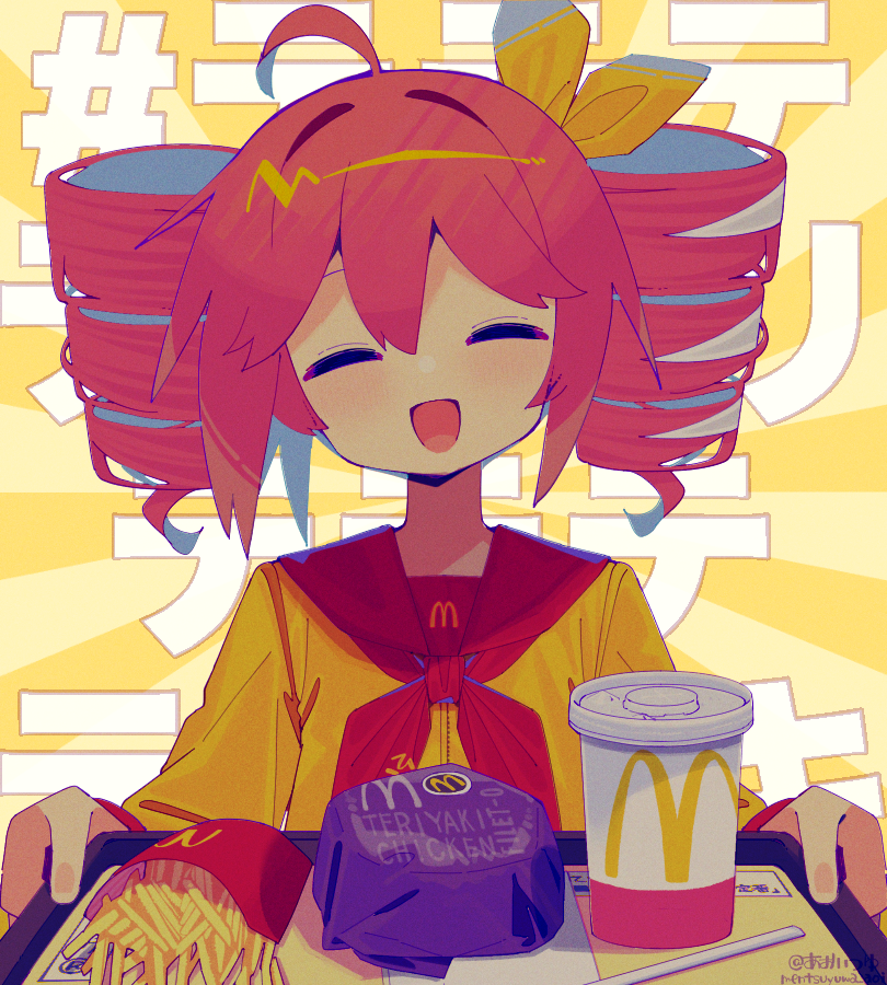 1girl ahoge aoi_tsuyu bow cup disposable_cup dress drill_hair food french_fries hair_between_eyes hair_bow hair_ribbon holding holding_tray kasane_teto kasane_teto_(sv) long_sleeves mcdonald's neckerchief open_mouth red_hair red_neckerchief ribbon synthesizer_v tetoris_(synthesizer_v) tray twin_drills wrapped_burger yellow_dress yellow_ribbon
