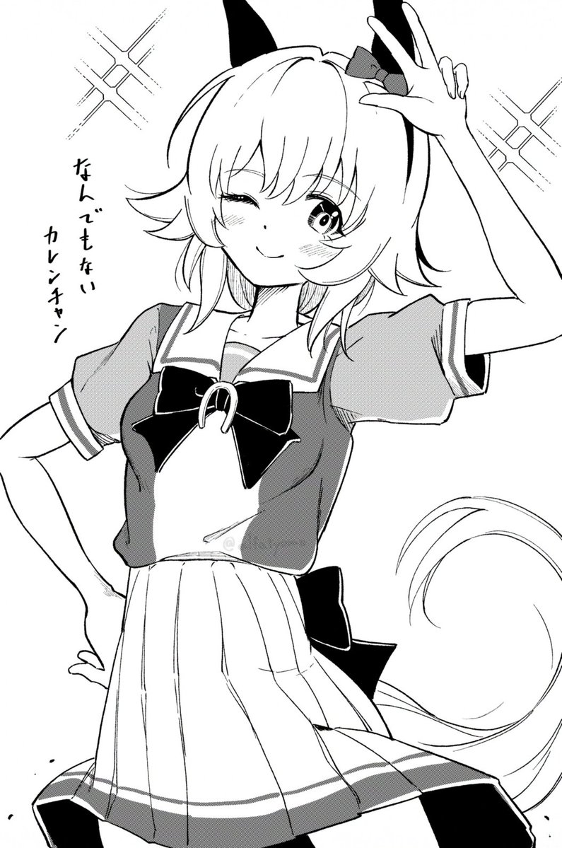 1girl ;) alfatyomo animal_ears bow cowboy_shot curren_chan_(umamusume) ear_bow ear_covers greyscale horse_ears horse_girl horse_tail horseshoe_ornament looking_at_viewer monochrome one_eye_closed pleated_skirt puffy_short_sleeves puffy_sleeves sailor_collar sailor_shirt school_uniform shirt short_hair short_sleeves simple_background skirt smile solo tail tracen_school_uniform umamusume white_background