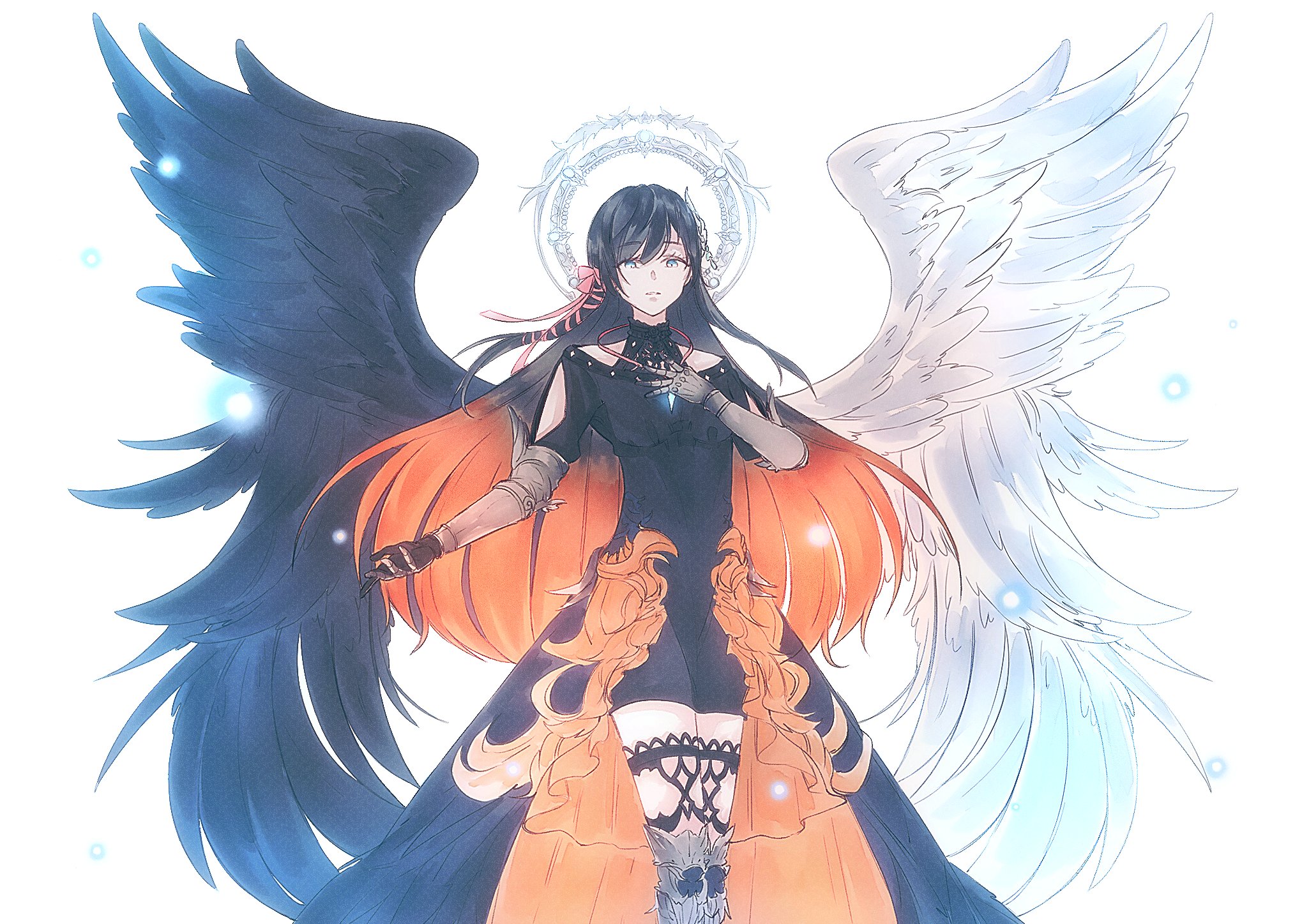 1girl asymmetrical_wings black_dress black_feathers black_hair blue_eyes corruption dark_persona dress feathered_wings feathers ff14hioo_oo7 final_fantasy final_fantasy_xiv frilled_thigh_strap fusion gaia_(ff14) gauntlets hair_ribbon halo hand_on_own_chest highres long_hair looking_at_viewer mitron_(ff14) multicolored_hair orange_hair pandora_(ff14) possessed possession revision ribbon ryne_waters solo spoilers square_enix thigh_strap two-tone_hair very_long_hair white_feathers winged_hair_ornament wings