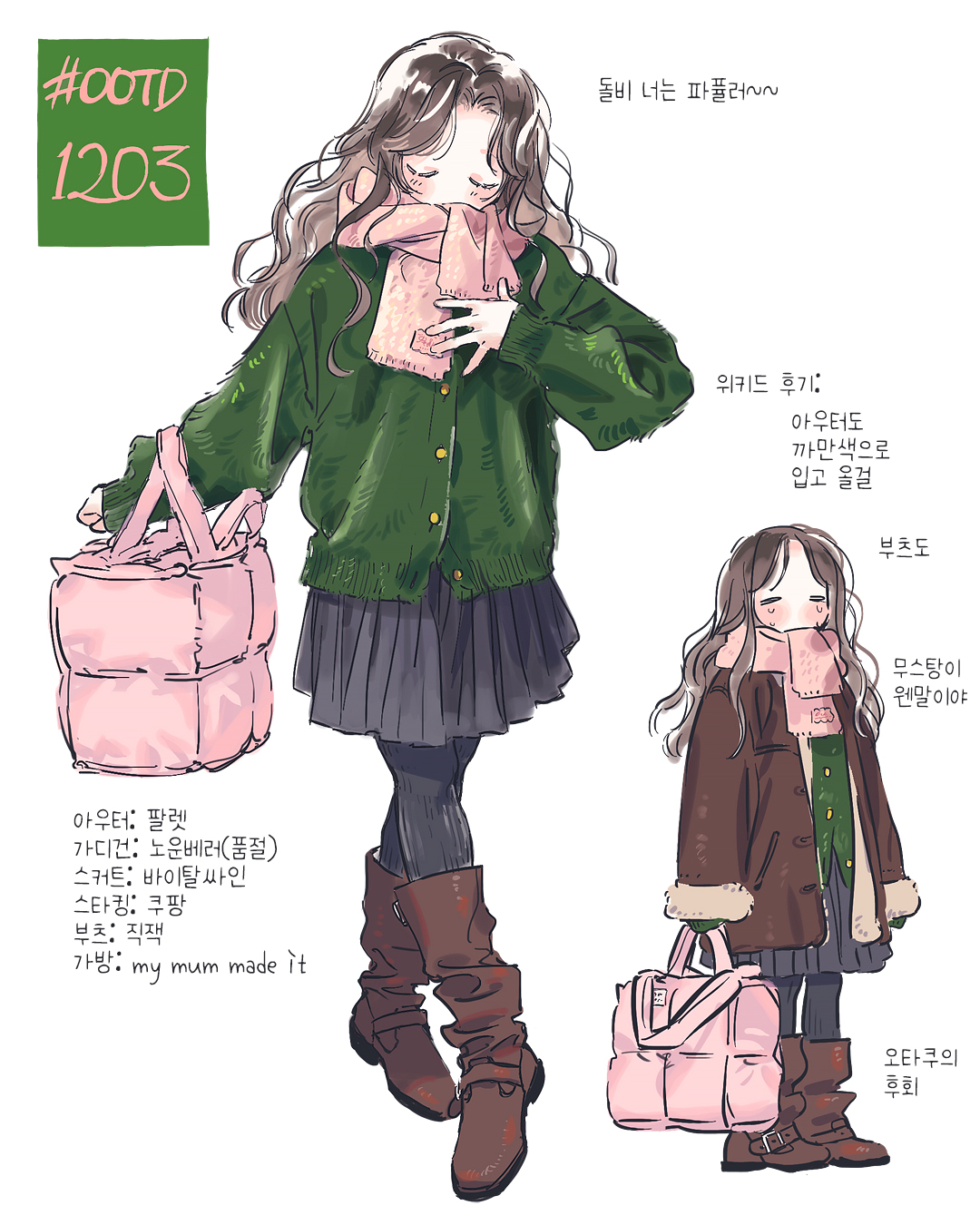 1girl bag bangoul boots brown_boots brown_coat coat green_sweater highres korean_text original pink_scarf scarf skirt sleeves_past_wrists standing sweater
