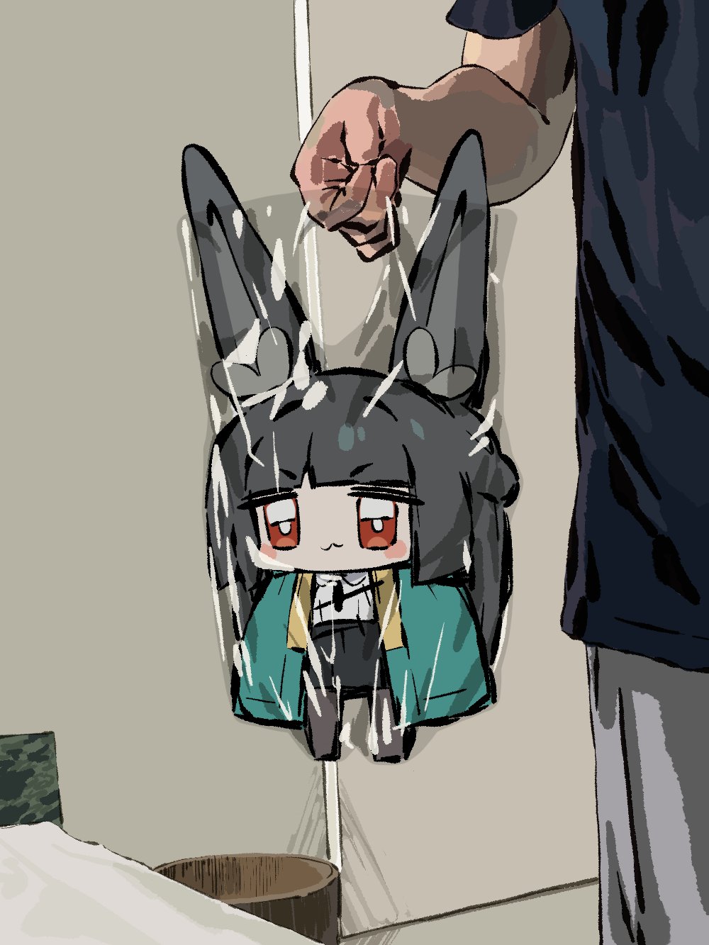 1girl 1other animal_ears bag black_hair blunt_bangs chibi coat fox_ears fox_girl full_body green_coat highres holding holding_bag hoshimi_miyabi in_bag in_container photo-referenced plastic_bag red_eyes sima_(startwitch) solo_focus zenless_zone_zero