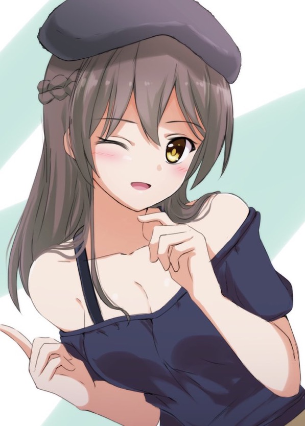 1girl beret blush braid breasts brown_hair cleavage collarbone half_up_braid hat heaven_burns_red lelie_(lelie_link) long_hair off_shoulder one_eye_closed ooshima_ichiko solo yellow_eyes