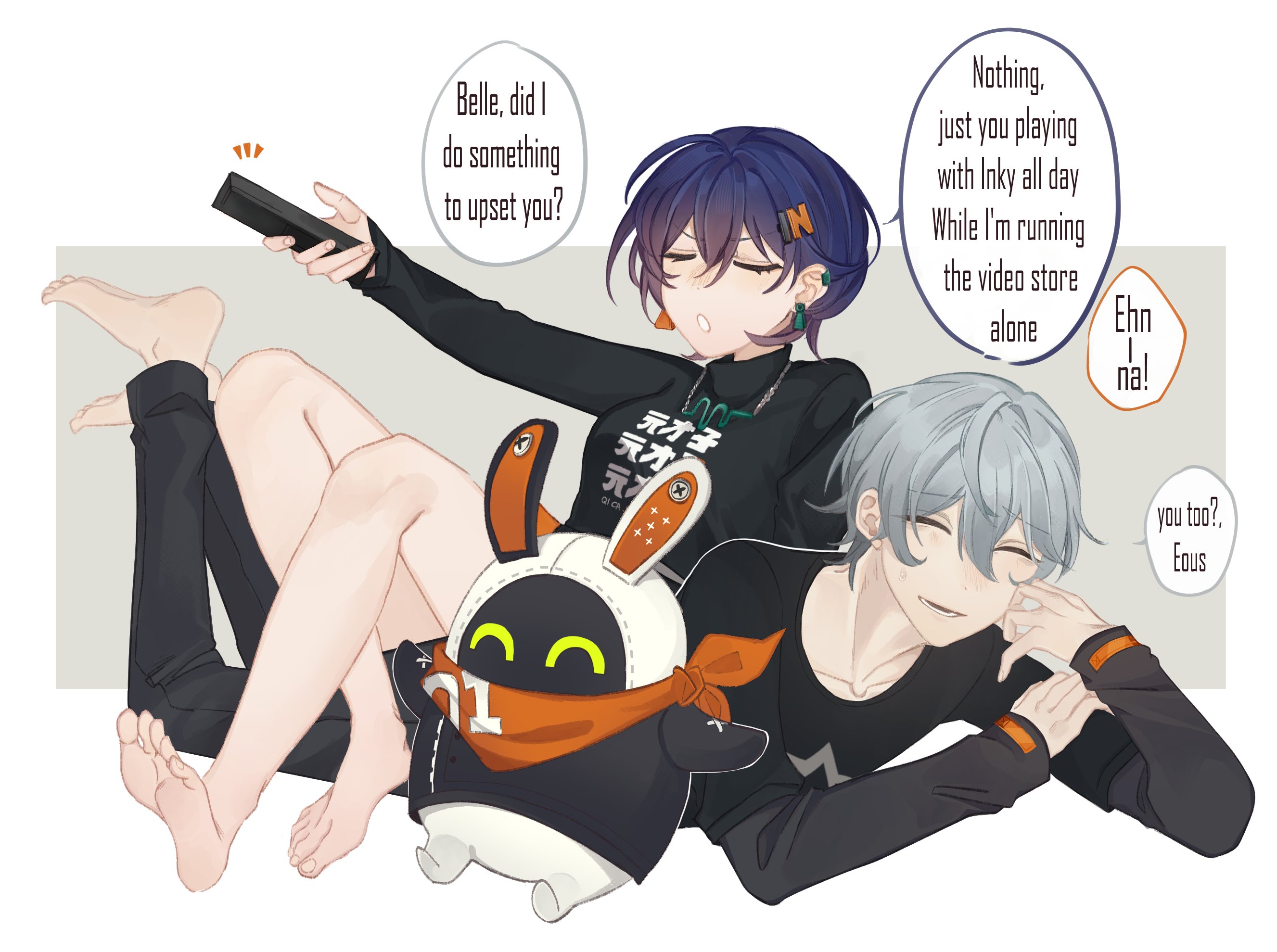 1boy 1girl 1other bangboo_(zenless_zone_zero) barefoot belle_(zenless_zone_zero) black_pants black_shirt blue_hair brother_and_sister closed_eyes controller english_text eous_(zenless_zone_zero) grey_hair highres holding holding_controller holding_remote_control lying mariroynum1 on_floor on_stomach pants remote_control shirt short_hair siblings sitting sitting_on_person smile thighs toes wise_(zenless_zone_zero) zenless_zone_zero