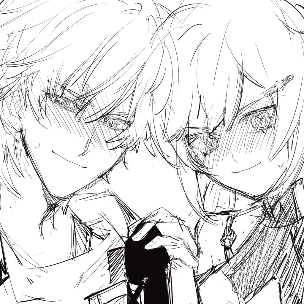 1boy 1girl black_gloves blush caelus_(honkai:_star_rail) fingerless_gloves gloves greyscale holding_hands honkai:_star_rail honkai_(series) monochrome nagai_yue partially qingque_(honkai:_star_rail) sketch sweat trailblazer_(honkai:_star_rail) upper_body white_background