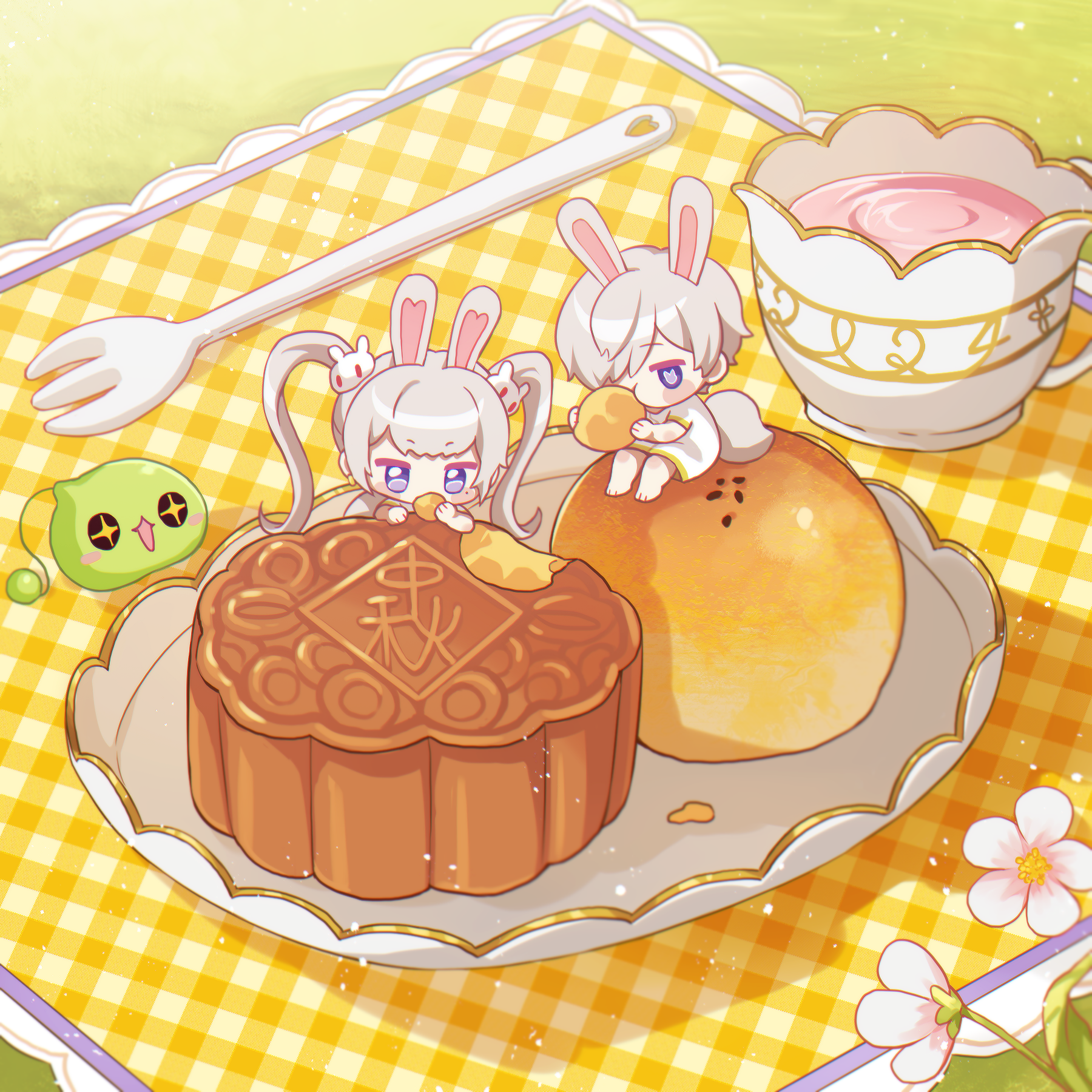 +_+ 1boy 1girl :d animal_ears blush_stickers cup dress eating flower food fork grey_hair hair_ornament highres holding holding_food leafwow lotus_(maplestory) maplestory mini_person miniboy minigirl mooncake open_mouth orchid_(maplestory) purple_eyes rabbit-shaped_pillow rabbit_boy rabbit_ears rabbit_hair_ornament rabbit_tail short_sleeves smile tail tea teacup tray twintails white_dress white_flower