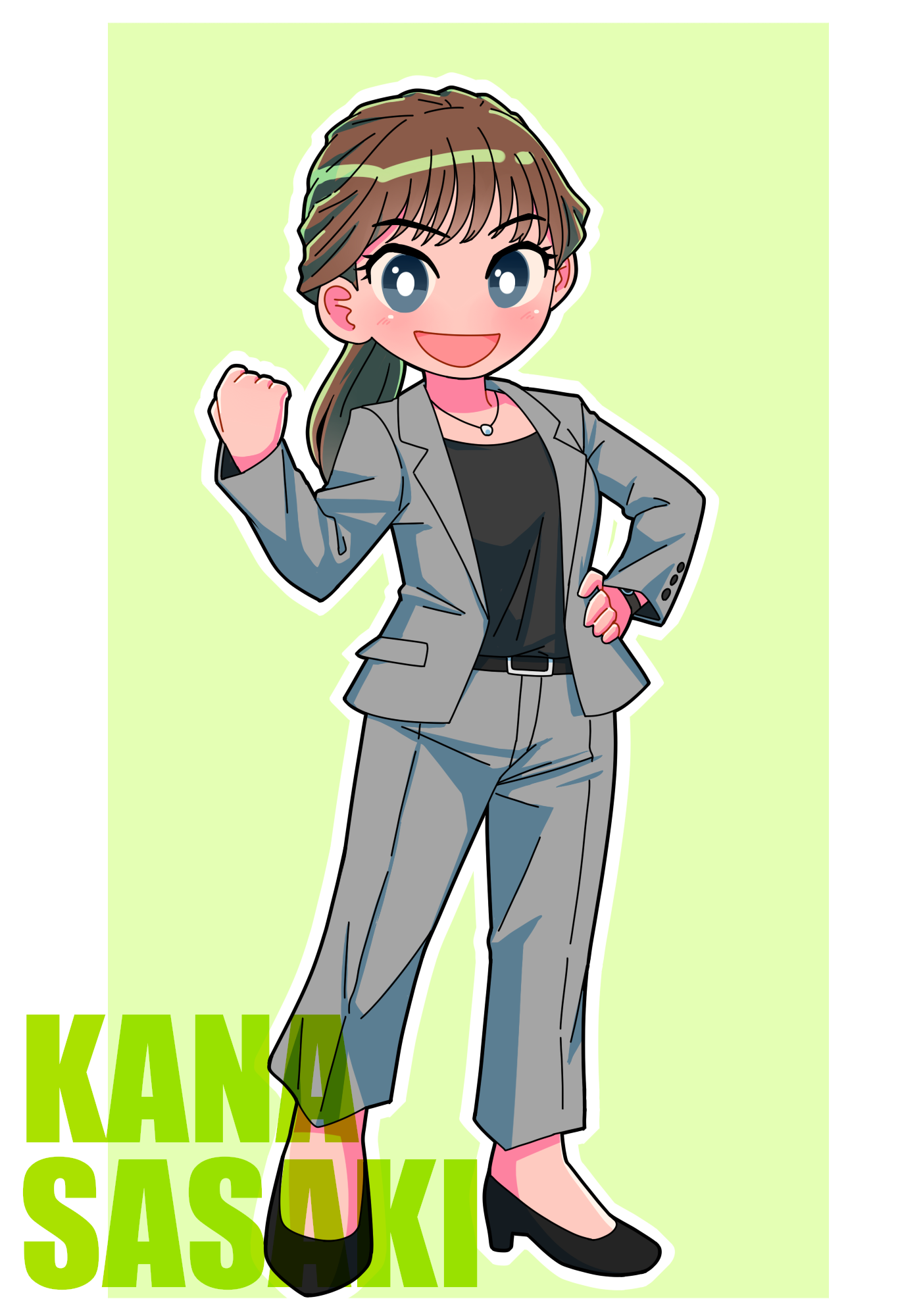 1girl :d animification belt black_belt black_high_heels black_shirt black_shoes blush border breasts bright_pupils brown_hair character_name clenched_hand commentary full_body green_background grey_eyes grey_jacket grey_pants hair_intakes hand_on_own_hip hand_up high_heels highres jacket jewelry lapels long_hair long_sleeves looking_at_viewer low-tied_long_hair low_ponytail medium_breasts necklace no_nose open_clothes open_jacket open_mouth pants ponytail sasaki_kana shirt shoes smile solo standing suit_jacket tokusatsu tsubasa_(godbardtsubasa) ultra_series ultraman_taiga_(series) watch white_border white_pupils wristwatch