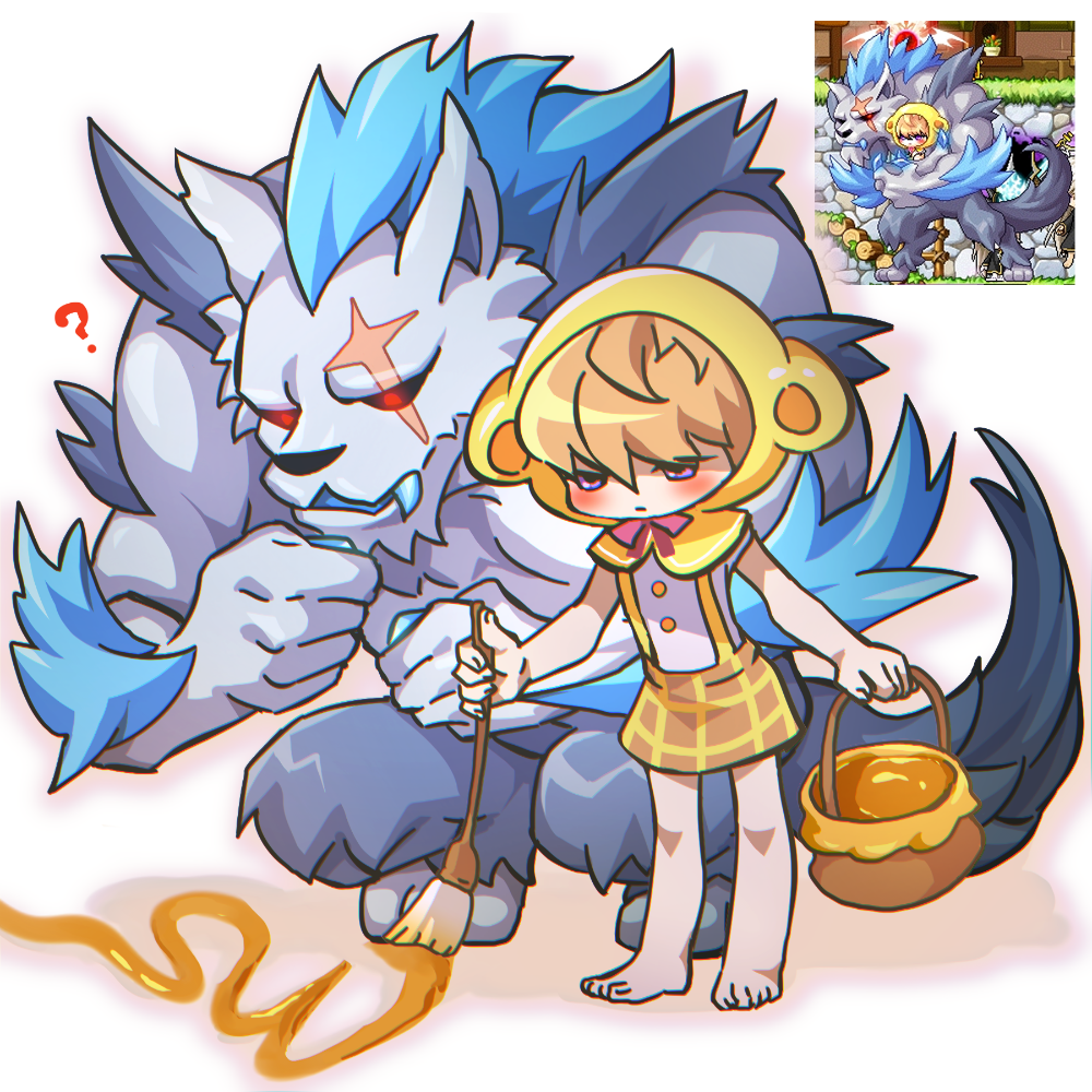 ? animal_ears bare_arms barefoot basket black_sclera blush brown_hair brown_skirt capelet character_request closed_mouth colored_sclera fake_animal_ears hair_over_eyes holding holding_basket holding_paintbrush honey hood hooded_capelet leafwow maplestory monster paintbrush purple_eyes red_eyes reference_inset scar scar_across_eye scar_on_face shirt skirt sleeveless sleeveless_shirt suspender_skirt suspenders white_background white_shirt yellow_capelet