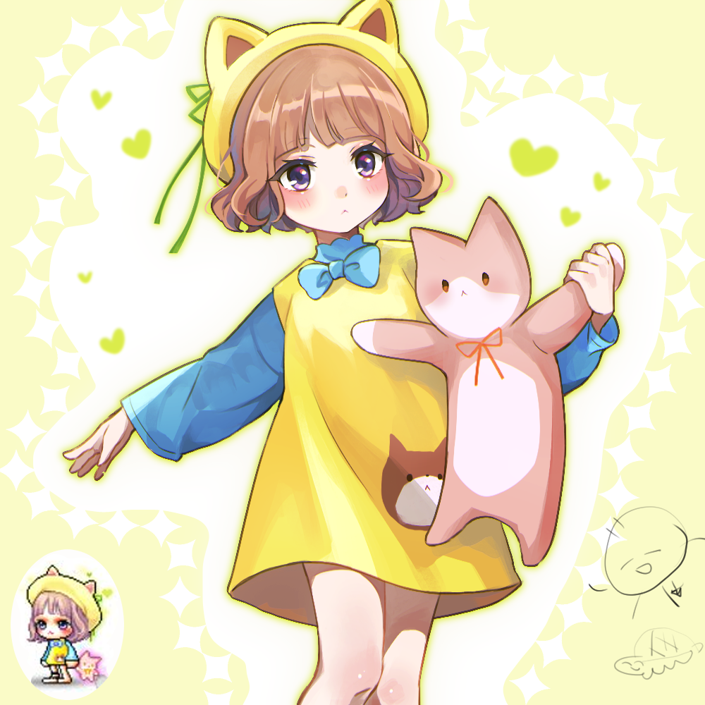 1girl :< animal_ears animal_hat beret blue_bow blue_bowtie blush bow bowtie brown_hair cat_ears cat_hat character_request chibi closed_mouth dress fake_animal_ears feet_out_of_frame green_outline green_ribbon hat heart holding holding_stuffed_toy leafwow long_sleeves maplestory outline puffy_long_sleeves puffy_sleeves purple_eyes reference_inset ribbon stuffed_animal stuffed_cat stuffed_toy yellow_dress yellow_hat