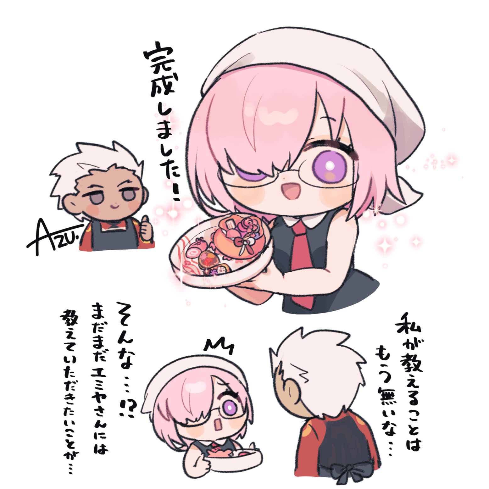1boy 1girl apron archer_(fate) archer_(third_ascension)_(fate) azu_(kirara310) black_apron chibi dark-skinned_male dark_skin fate/grand_order fate_(series) highres mash_kyrielight pink_eyes pink_hair simple_background tan white_background white_hair