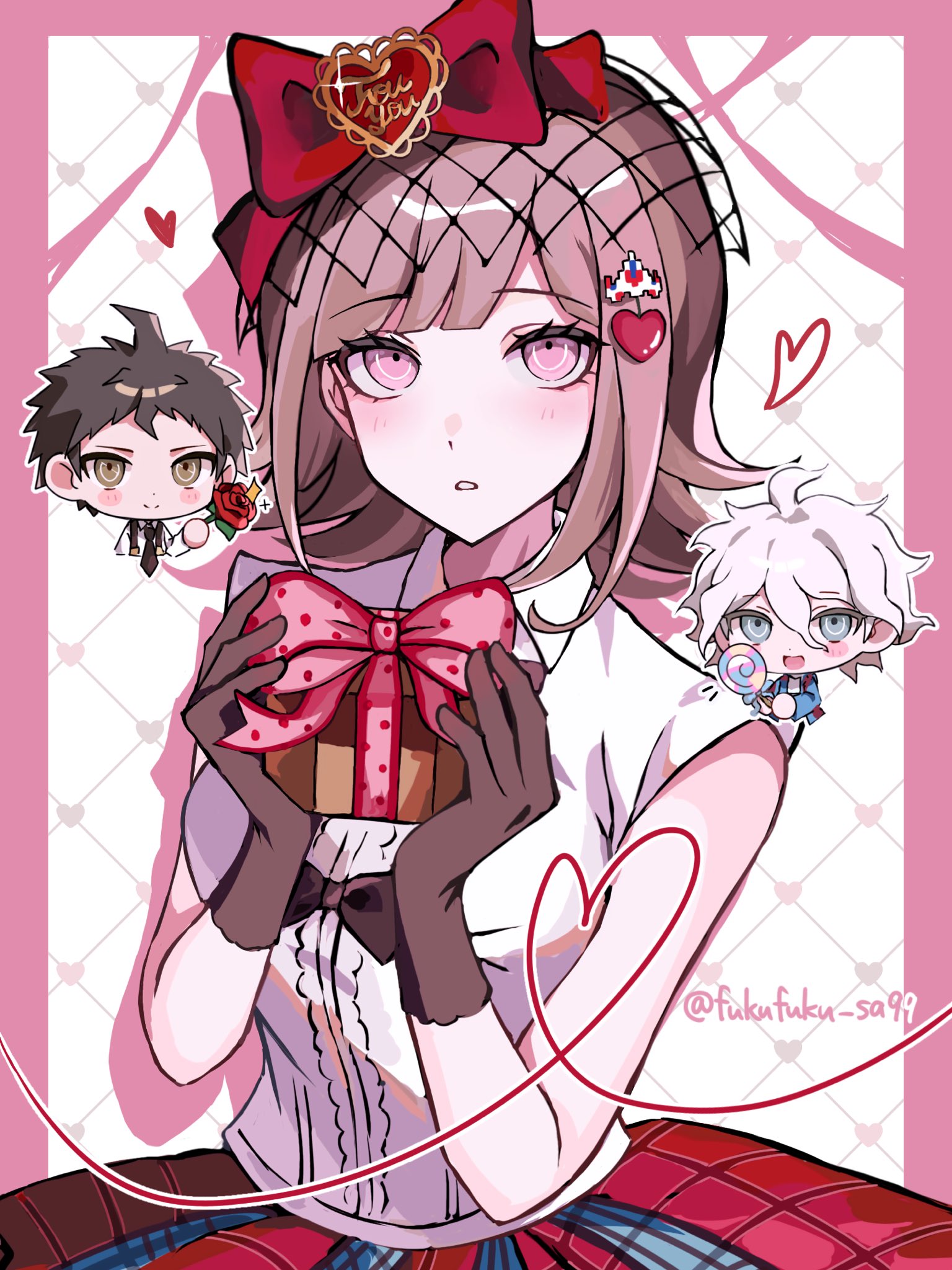 1girl 2boys ahoge alternate_costume black_gloves blue_eyes blush bow box brown_hair center_frills chibi danganronpa_(series) danganronpa_2:_goodbye_despair flower frills fuku_sa gift gift_box gloves green_eyes hair_bow highres hinata_hajime holding holding_flower komaeda_nagito looking_at_viewer multiple_boys nanami_chiaki pink_eyes red_bow red_flower red_rose red_skirt rose shirt short_hair skirt sleeveless sleeveless_shirt twitter_username valentine white_hair white_shirt