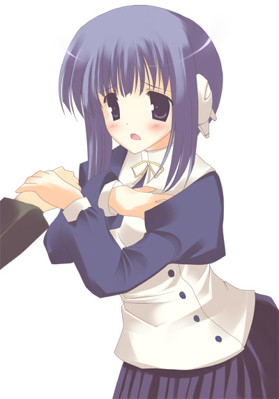 1girl 2000s_(style) bad_id blue_hair blush commentary_request d: furrowed_brow hand_on_own_chest holding_hands ilfa_(to_heart) juliet_sleeves kisaki_yuu long_sleeves open_mouth puffy_sleeves purple_eyes purple_skirt robot_ears short_hair_with_long_locks simple_background skirt solo_focus to_heart_(series) to_heart_2 white_background