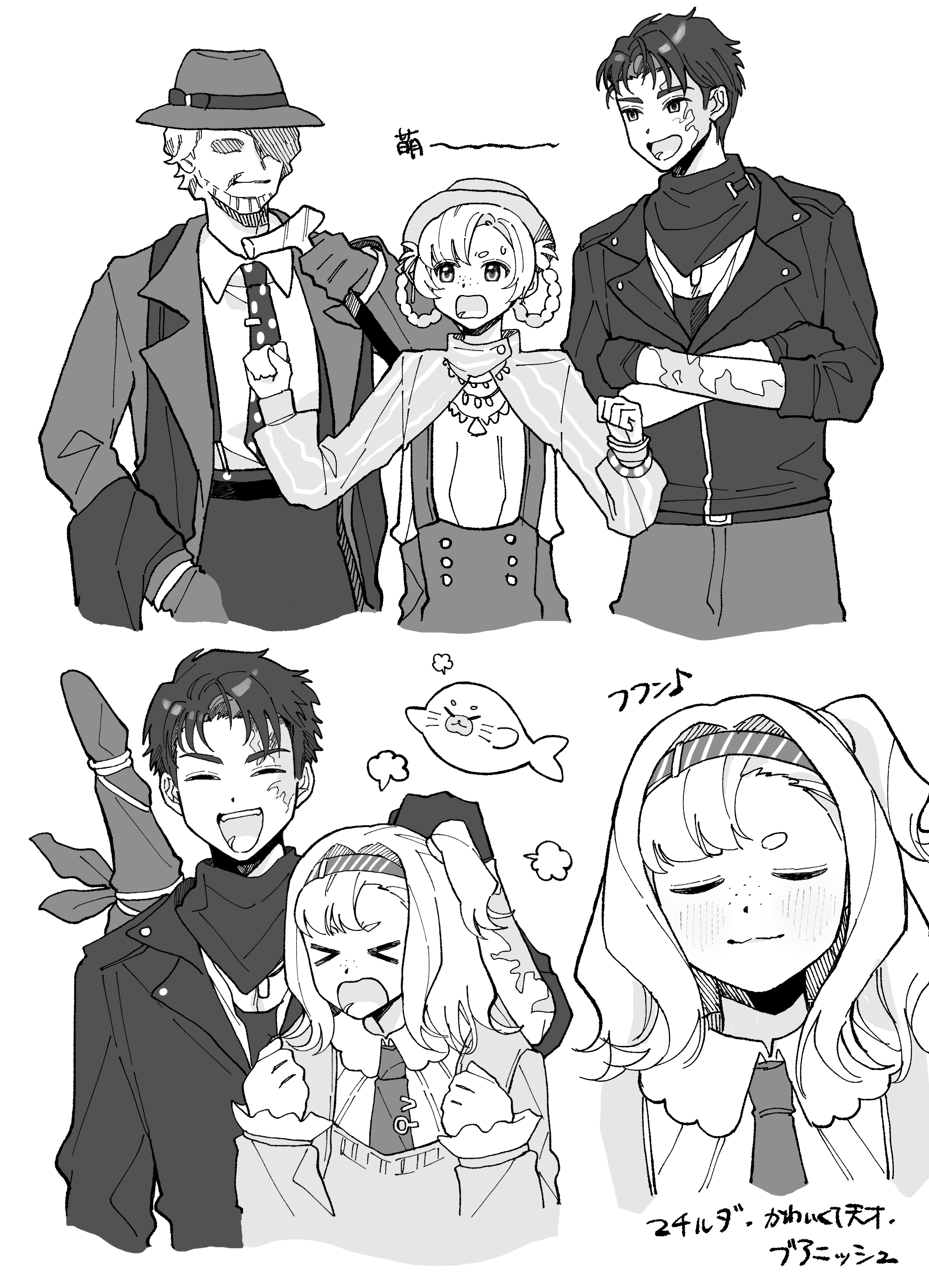 >_< 1girl 2boys :d :o absurdres boater_hat braid braided_hair_rings burn_scar cane clenched_hands collage collared_shirt crossed_arms fedora freckles gloves greyscale hair_rings hairband hand_on_another's_head hands_up hat highres holding holding_cane j_(reverse:1999) jacket mannequin matilda_bouanich matilda_bouanich_(the_genius's_holiday) medium_hair monochrome multiple_boys multiple_views neckerchief necktie official_alternate_costume one_side_up open_mouth overall_shorts overalls pioneer_(reverse:1999) puff_of_air reverse:1999 rikini_sushi scar scar_on_face scarf seal_(animal) shirt short_hair shrug_(clothing) smile suit_jacket sweat sweater upper_body weapon weapon_on_back white_background